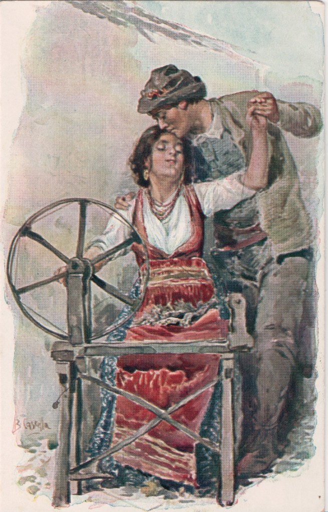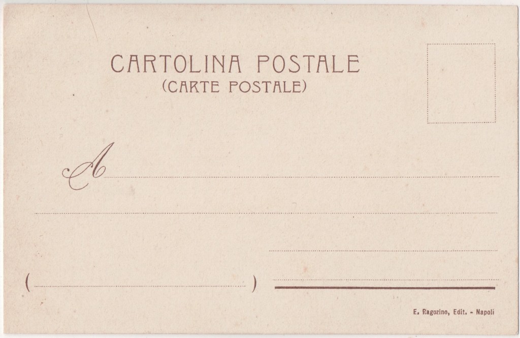 Professor Aurelio Caggiano, (18 September 1869 to 1940), painter, sculptor and photographer, Naples. Son of the sculptor Emanuele, he soon left his study of humanities in favour of architecture. With the guidance of his father he devoted himself to sculpture. Adhering to the fashion for realism, he preferred to model his favourite subjects, commoners, rascals, fishermen and farmers in bronze. In the 1890s he was among the first in Naples to undertake artistic photography, acquiring a good reputation2. His Neapolitan Types photographs seem to be self-published. They present striking images in sepia taking up the whole picture side of the card in a modern fashion. In 1908 he provided the illustrations for Mala Vita Napoletana, a collection of stories on the Neapolitan underworld by a magistrate.