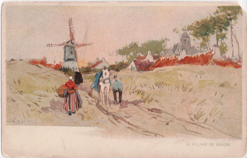 Henri Cassiers (11 August 1858 to 27 February 1944) was a Flemish artist, best known for his applied art: illustrations, posters, wall charts and postcards, often with a maritime aspect. Cassiers trained as an architect before training as an artist. As well as maritime scenes and city and village views, he was particularly attracted by Dutch costumes, especially those from Zeeland and Katwijk and he produced series of postcards featuring different regional dress. He illustrated many popular weekly magazines and various books from 1886 to 1893. In de Guide descriptif illustré de la côte de Flandre9, there are no fewer than 106 drawings by Cassiers. Cassiers’ style was also excellent for publicity purposes and tourist places and shipping companies regularly called upon him. From 1898 he worked on many posters, postcards, menu cards and other advertising materials for the Red Star Line in particular. He was also a member of the Belgian artists’ association Les Hydrophiles10. He came to the attention of British postcard collectors with a fine series of cards for the 1901 Glasgow Exhibition, one of which is here.