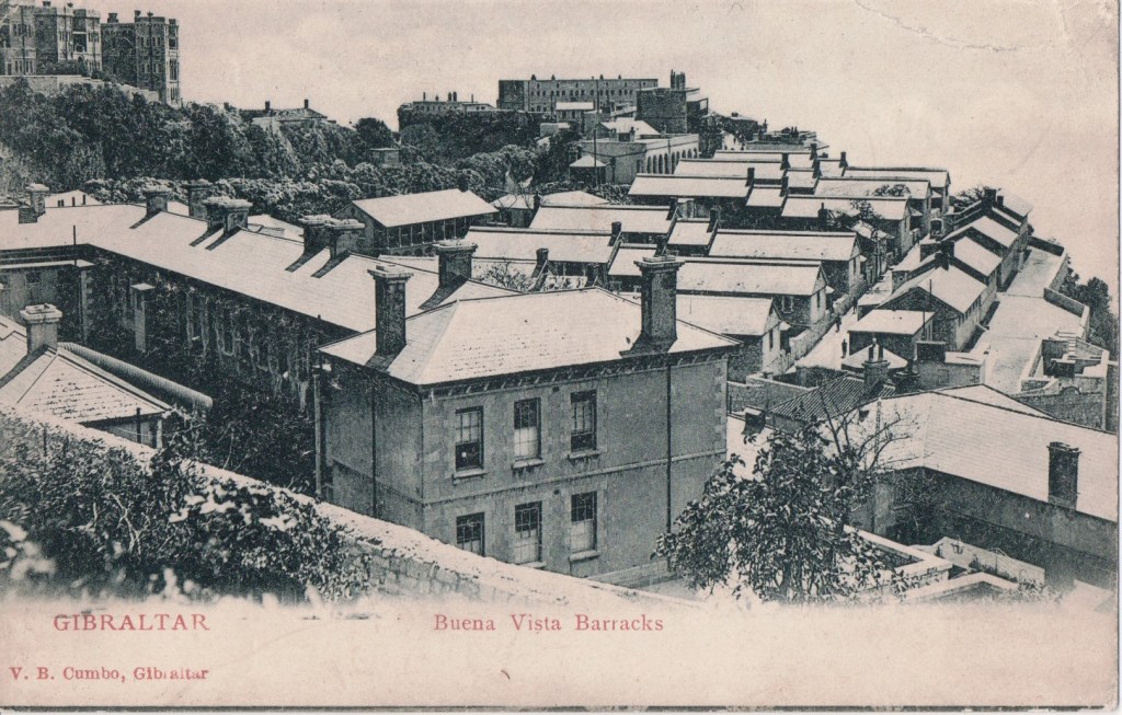 This card: The Buena Vista barracks was constructed in the 1840s to the designs of Major General Sir John Thomas Jones; it was one of several that were built in the territory following a report that he produced on Gibraltar’s defences. Also known as the “Stone Block”, its simple design consisted of a single rectangular block with windows on each side, divided into two sections on each floor with three wide intercommunicating rooms in each section. It was used for many years by the Royal Gibraltar Regiment but was subsequently converted for commercial use as factory and storage units. Source: wikipedia