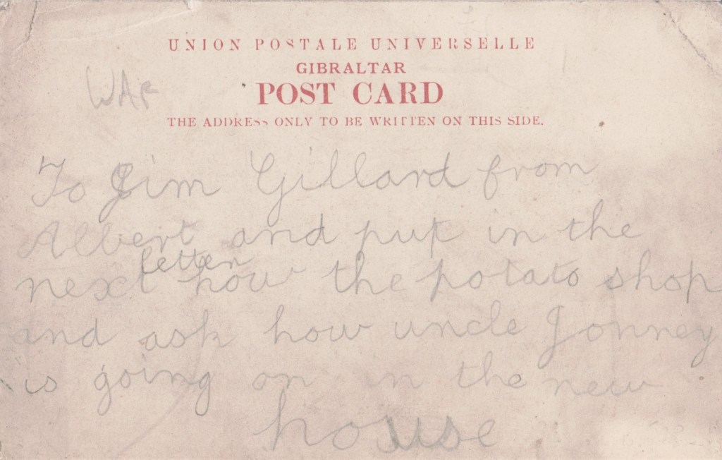 The 1901 Register Of Inhabitants in Gibraltar show Joseph Cumbo as aged 31 and born in Malta. He was employed as an engine-driver. He lived at 13 Waterport Street with five others. He was single and had the family relationship of nephew – presumably living with an aunt. The 1911 register shows Joseph/Jose Cumbo now aged 41 and living at no 3 Castle Street in the Dockyard District. By this time he was married and head of a household of four. His occupation was listed as read and write55. Undivided photocards were also published under the names Cumbo & Montegriffo and Montegriffo & Cumbo (qv).