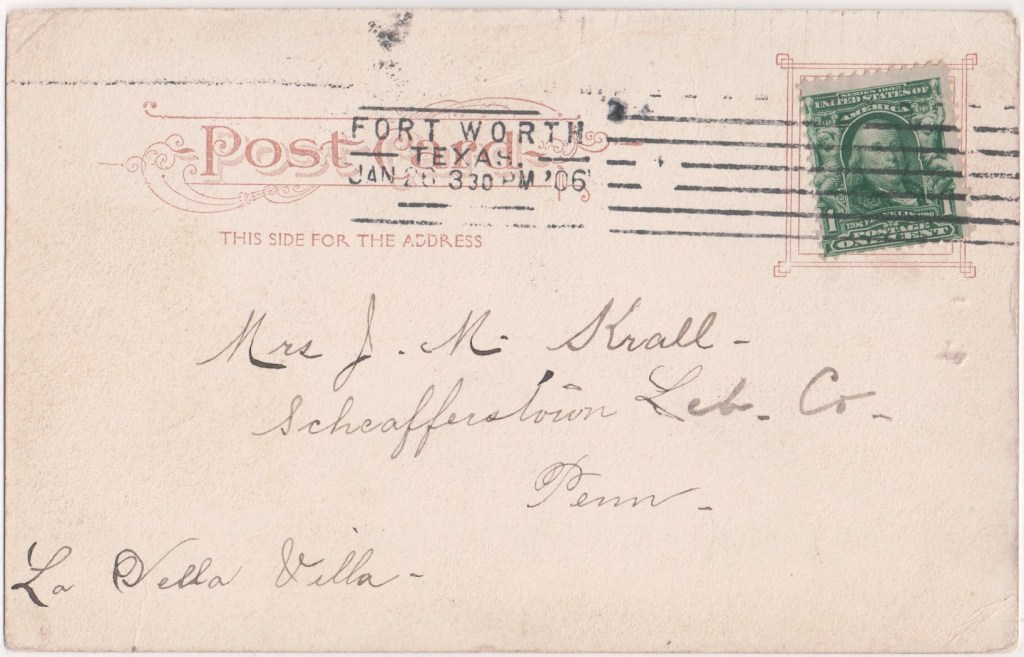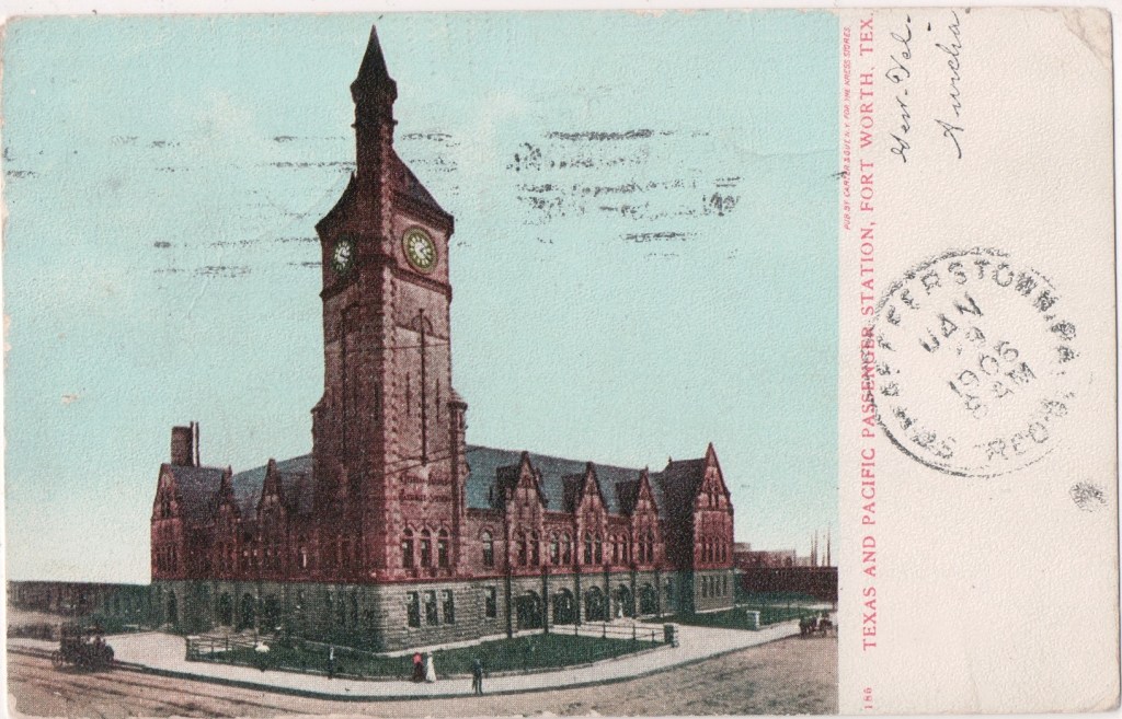 This card: Built between February and December 1899 at a cost estimated at $300,000, the new Texas & Pacific railroad passenger depot was designed by Otto Lang, an architect in the T&P’s engineering department. The exterior was built of Pecos sandstone and Thurber brick. The roof had Spanish tiles. The waiting room had classical columns supported by marble piers. The floor was tiled in marble. Windows were of cut glass. The depot was located at the intersection of Main and Lancaster streets east of the Al Hayne memorial, where the Frank Kent Cadillac dealership later stood.