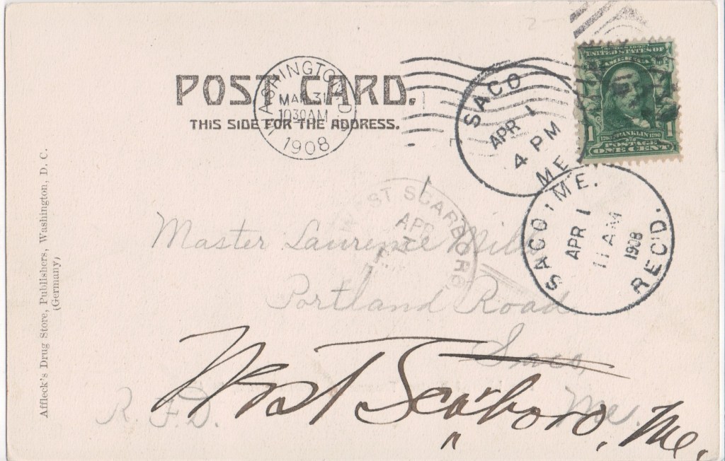 Affleck’s Drug Store, Publishers, 1429 or 1529 Pennsylvania Ave16, Washington, D.C. Originally Acker and Affleck, Philip J Affleck junior of Berryville, Virginia acquired his partner’s interest in the store in 1900 and traded after that under his own name17. An advertisement in 1914 also lists branches at 904 G Street NW, 9th and D Streets NW and the corner of 15th and F Street underneath the old Rhodes Tavern where British soldiers drank after burning the White House, later to become the National Press Club in 190918.