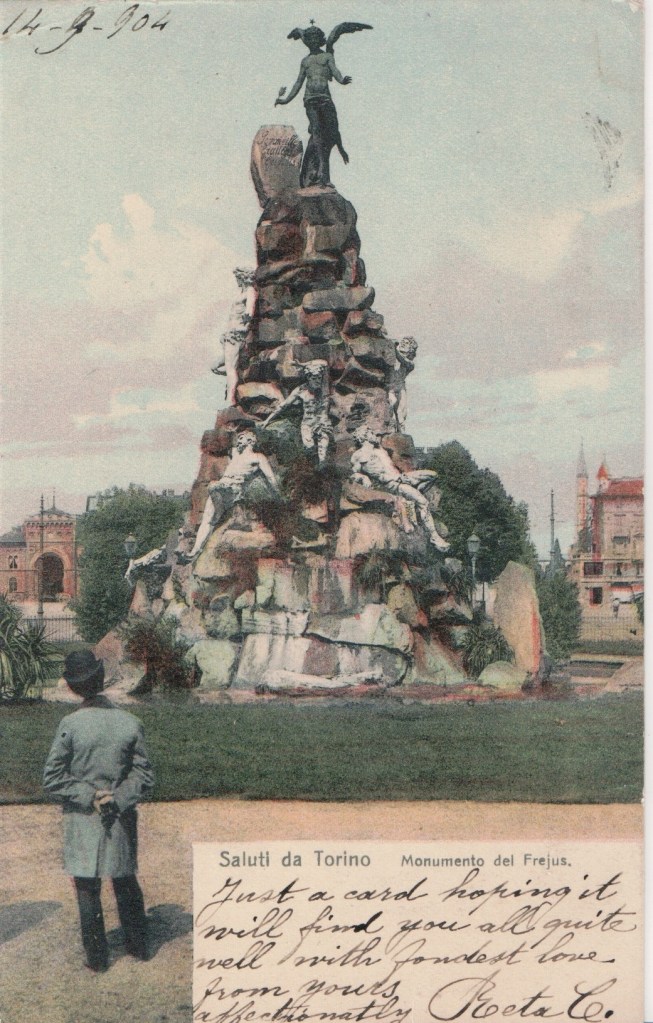 This card: The monument to the Traforo del Frejus is a monumental fountain located in the piazza Statuto in Turin. The monument is dedicated to the Frejus tunnel. The Fréjus Rail Tunnel (also called Mont Cenis Tunnel) is a rail tunnel of 13.7 km (8.5 miles) length in the European Alps, carrying the Turin–Modane railway through Mont Cenis to an end-on connection with the Culoz–Modane railway and linking Bardonecchia in Italy to Modane in France. Its mean altitude is 1,123 m and it passes beneath the Pointe du Fréjus (2,932 m) and the Col du Fréjus (2,542 m).
