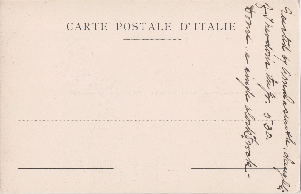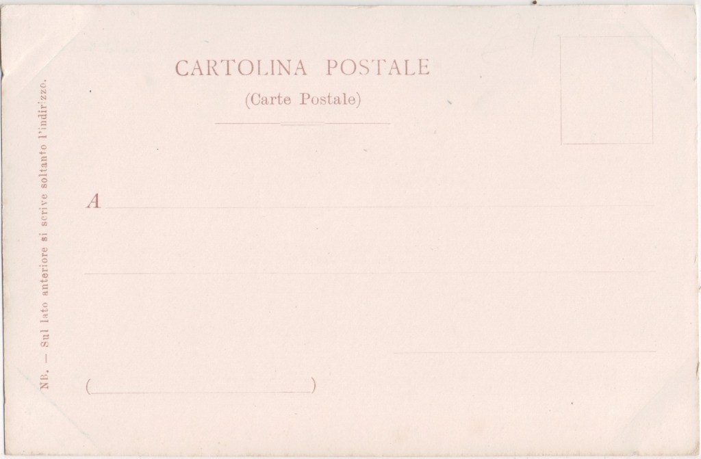 Gaetano Nino Albertieri, dealer in musical instruments, via L. Cadorna, Bordighera. Albertieri led a tango-rumba orchestra. In 1895 he published the score of the waltz Over the waves by Juventino Rosas. His postcards of the Bordighera area extended into the divided-back period. In 1912 Nino Albertieri was one of three friends who built the Teatro Pietro Zeni on ground in Piazza Mazzini in Bordighera in honour of their friend tenor Pietro Zeni21.