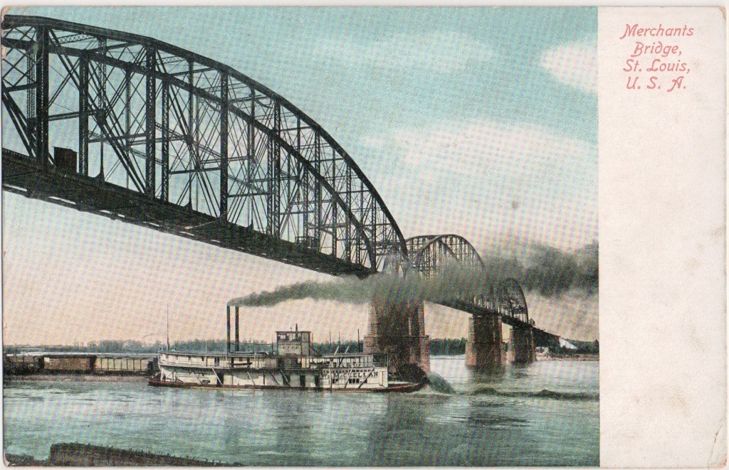 This Card: The vessel seen passing under the Merchant’s Bridge at St. Louis is a sternwheel towboat William McClellan built in 1901 at Jeffersonville, Indiana by Howard Ship Yard. Wiggins Ferry Company based her in St Louis and sold her to Baton Rouge, Louisiana in 1915.