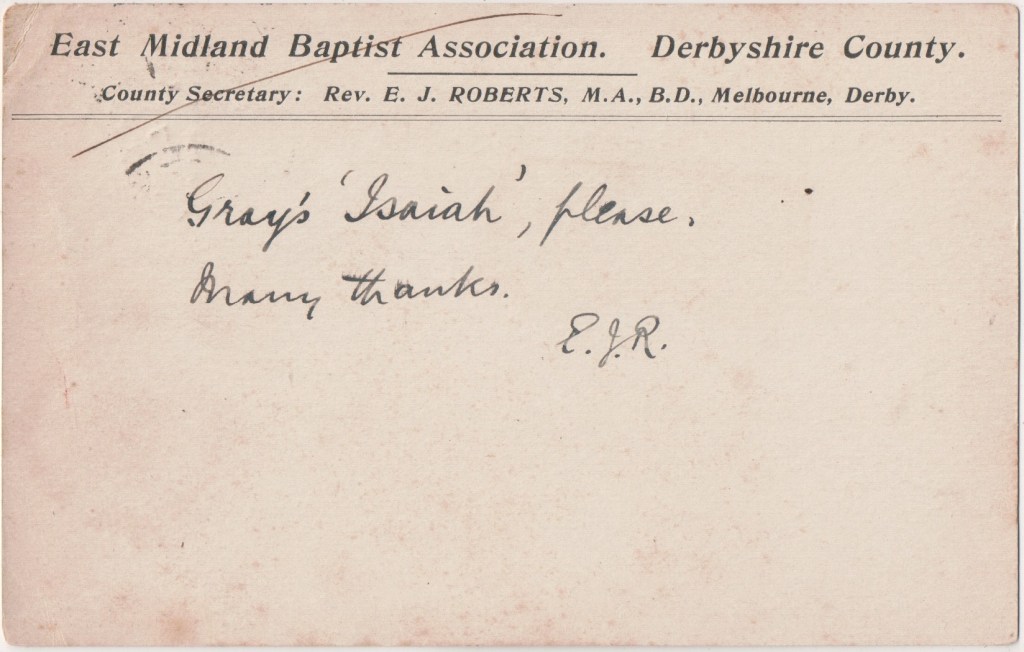 Roberts was a contributor to the Expository Times, contributing The Great Text Commentary in January 1911. I would assume that Mr Roberts was either offering to review Gray’s book or asking for the review copy.