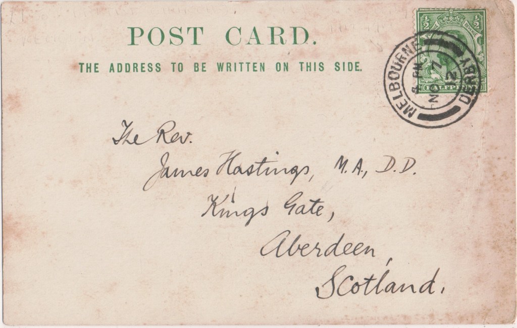 This card was postally used in November 1912 when the Reverend E J Roberts of Melbourne wrote to the Scottish theologian James Hastings in Aberdeen. Hastings had established The Expository Times in 1889 as an academic journal of biblical studies, theology, and ministry, still in publication. Melbourne is a market town and civil parish in South Derbyshire, England.