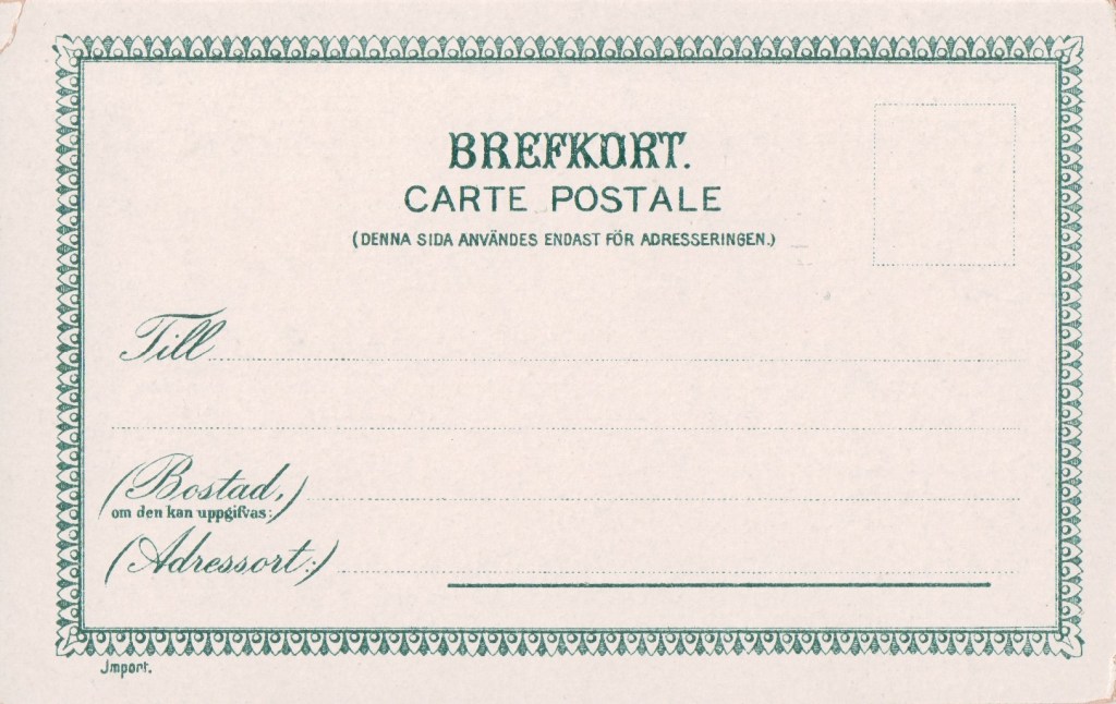 Axel Eliassons Konstforlag, Stockholm, Sweden’s leading manufacturer of postcards into the mid-twentieth century. Eliasson got the idea for postcard publishing during his studies in Berlin and started his art publishing house in Stockholm in 1890. Initially Eliasson himself was behind the camera and, unlike much of the competion, was able to capitalise on Swedish manufacture. His topographicals started out locally with Stockholm and Gothenburg and spread throughout Scandinavia. His official postcards of the 1897 Stockholm exhibition were a great success5. Another interesting ethnographical here.