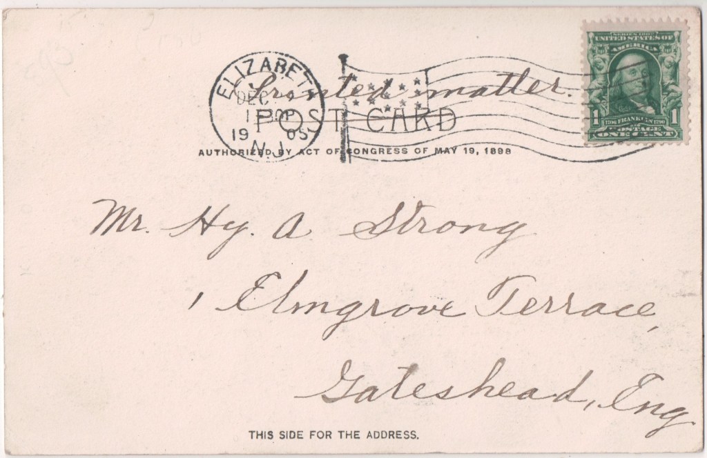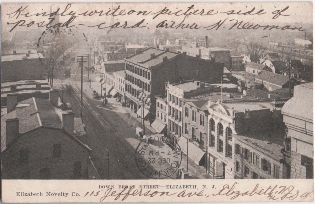 Elizabeth Novelty Company, 215-217 Broad Street, Elizabeth traded in office and personal stationery, sheet music, Kodak cameras, books, and sporting goods. They were specialists in photographic development and printing with a 24 hour service. Elizabeth is a city and the county seat of Union County. Originally called Elizabethtown and part of the Elizabethtown Tract, it was founded in 1664 by English settlers. The town was not named for Queen Elizabeth as many may assume, but rather for Elizabeth, wife of Sir George Carteret, one of the two original proprietors of the colony of New Jersey. Clinton Gilbert of the company was a member of the Elizabeth Board of Trade in 1907.