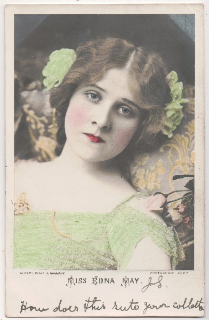This card: Edna May Pettie (2 September 1878 to 1 January, 1948), known on stage as Edna May, was an American actress and singer. A popular postcard beauty, May was famous for her leading roles in Edwardian musical comedies. May was born in Syracuse, New York, to Edgar and Cora Petty. The family later changed the surname to Pettie. She studied music at the New York Conservatoire as a teenager. In 1897, May played Violet Grey in The Belle of New York with only moderate success. The following year, the production played in London, becoming a hit and running for 697 performances, making May a star. May was known for her beauty and received tremendous attention from male admirers. In 1907, she married millionaire Oscar Lewisohn causing her retirement from the stage. The couple settled in England.