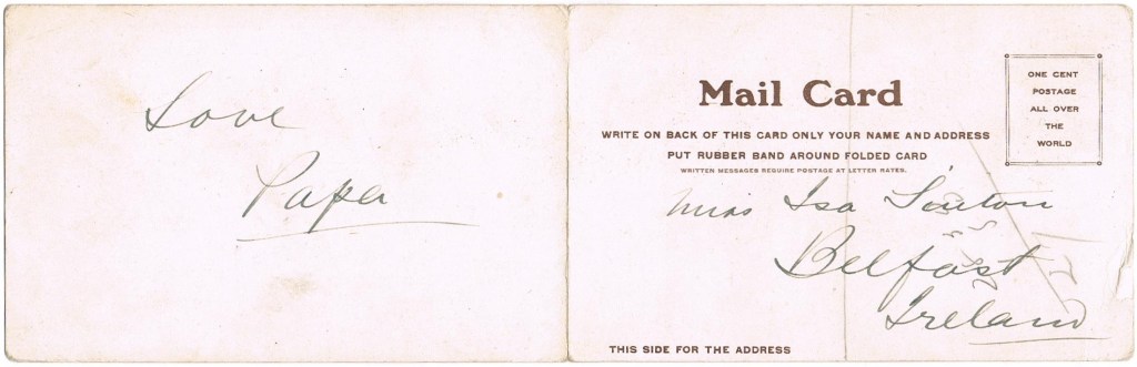 This panoramic (10⅞ by 37⁄16 inches) bears the instructions: Write on back of this card only your name and address. Put rubber band around folded card, Written messages require postage at letter rates. One cent postage all over the world. It was produced for Imlay by well-known San Francisco publisher Edward Mitchell (qv).