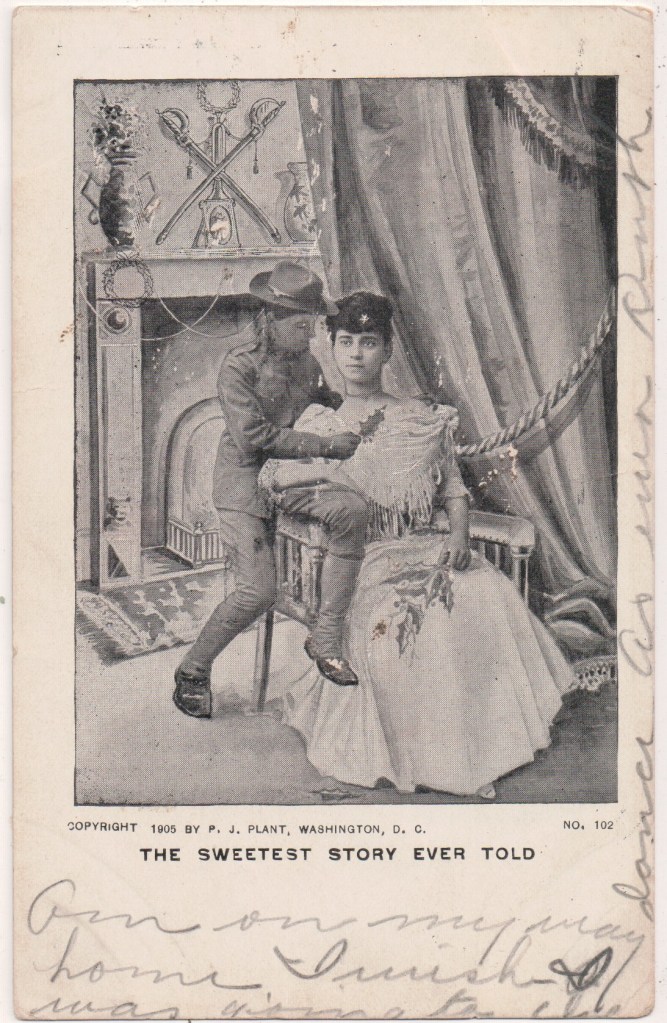 The image in this card prompts a number of observations: it appears to show a woman dressed in military uniform woing a young man in a military cap and a white dress. There may be a reference to reconciliation after the US Civil War going on here.