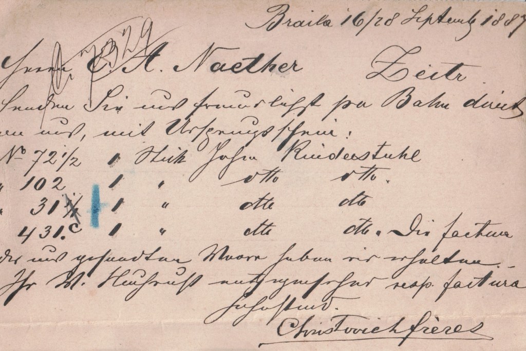 This card: This seems to be an order in 1887 by a firm called Christovich freres of Brăila, Romania, to E. A. Naether in Zeitz, a city in what is now Saxony-Anhalt in Germany. The order is for children’s high chairs, the first being 1 St. hohen Kinderstuhl .