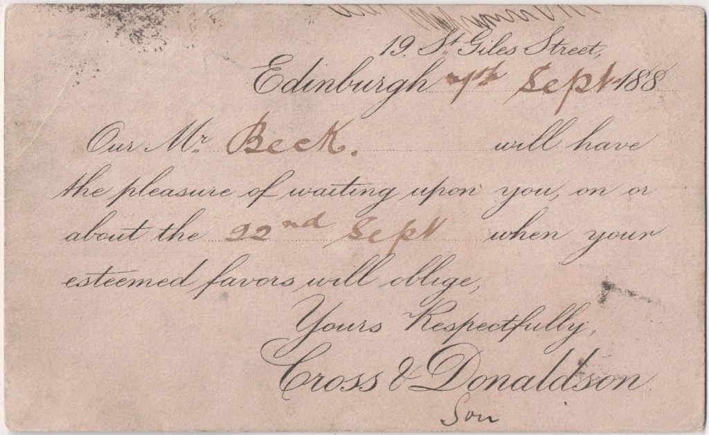 This card: Cross & Donaldson, wholesale seed and oilcake merchants. In 1875 they were at 11 Assembly Street in Leith. Thereafter in West Bowling Green Street, Leith. In 1880 they were also at 60 North Bridge, in 1886 that had changed to 41 Constitution Street, Leith and, in 1888, 19 St Giles Street, Edinburgh.
