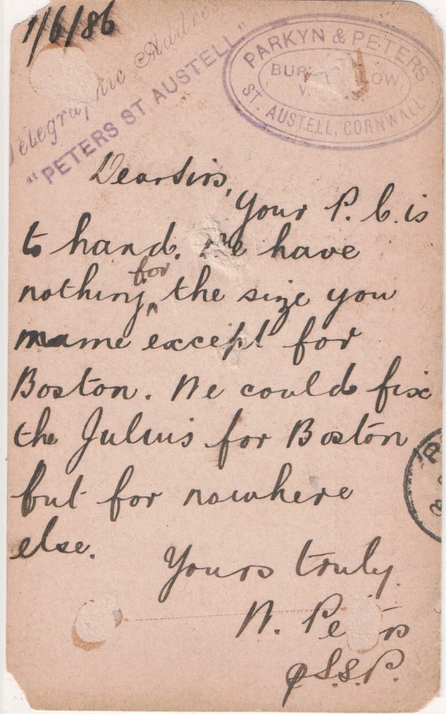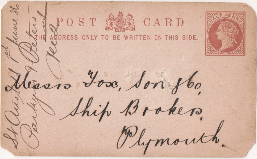 This card from Parkyn & Peters, China Clay Merchants, of St Austell, Cornwall to Fox, Son and Company, shipbreakers of Plymouth on 1 June 1886: