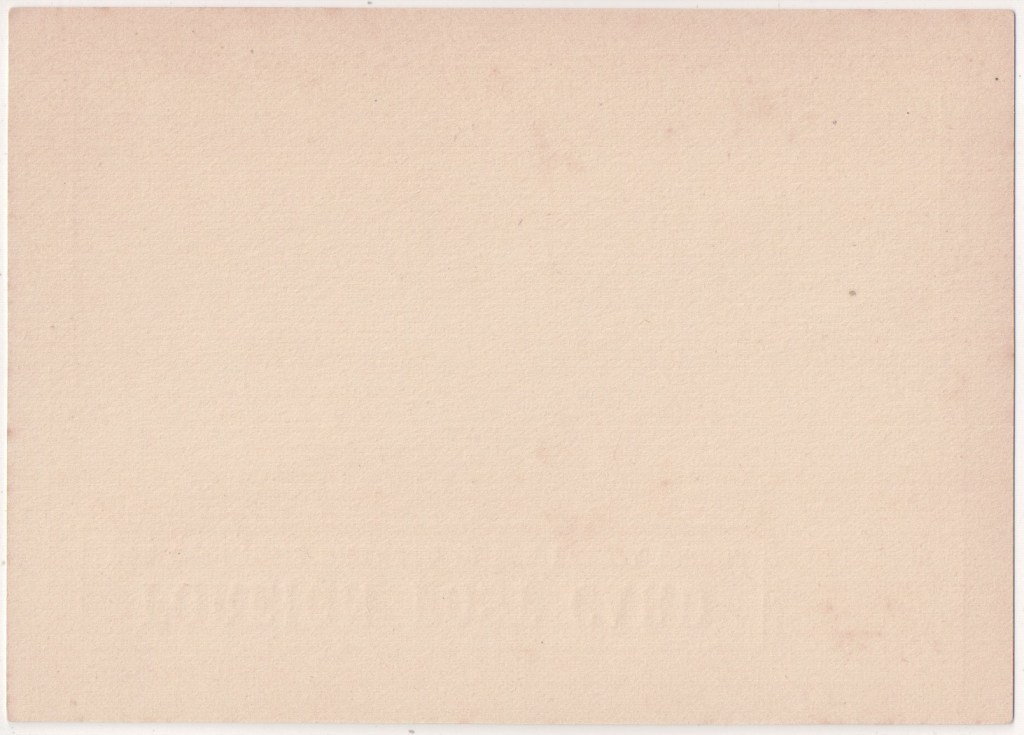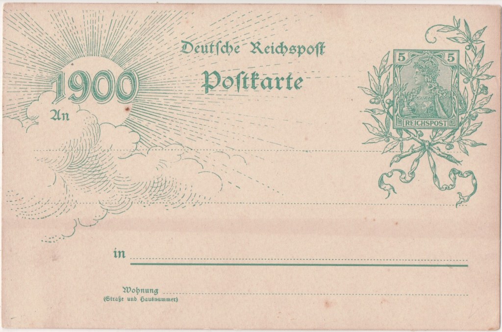 Published 28 December 1899. Format 140 x 90mm. A special postcard issued to celebrate the turn of the century. The value stamp is a pre-printed Germania 5Pf stamp inscribed “REICHSPOST”, with decorations (laurel branches around the value stamp). The design on the left hand side depicts the year “1900”, in front of a sun emerging from the clouds.