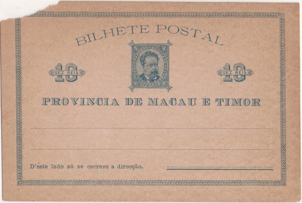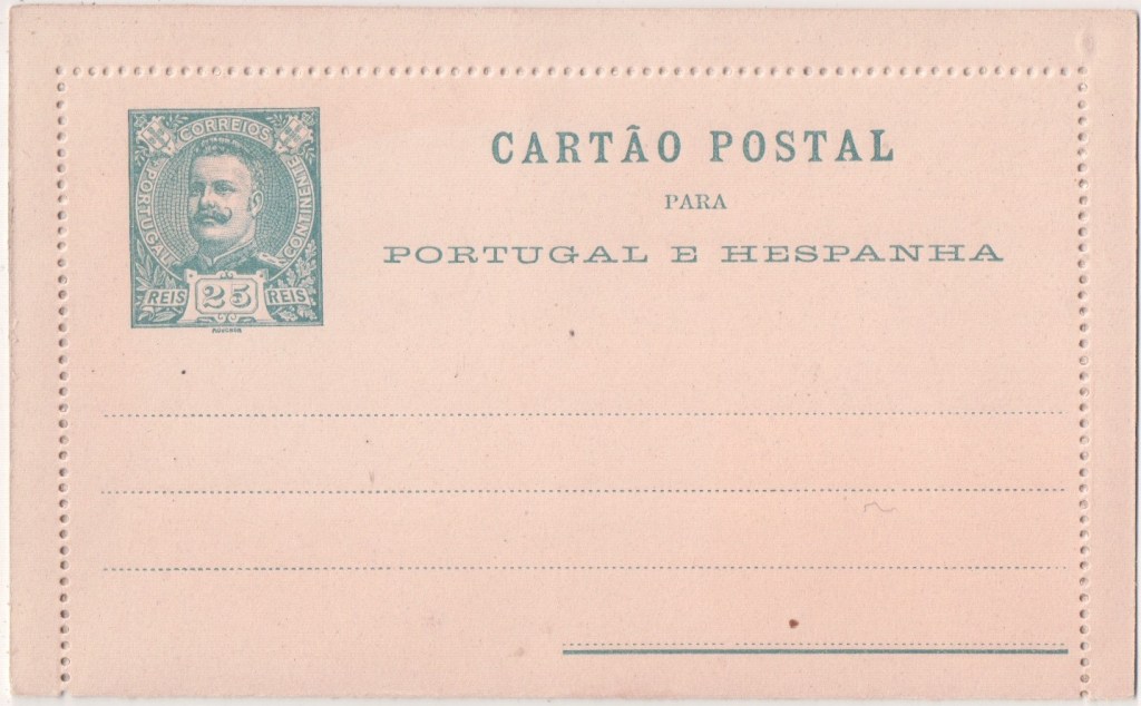 Cartão Postal translates as both postcard and lettercard. This card was issued for Portugal’s “Continente” [mainland] postal service.The stamp features an 1895 25 reis stamp featuring King Carlos I. Carlos I (28 September 1863 to 1 February 1908), known as “the Diplomat”, “the Oceanographer” among many other names, was King of Portugal from 1889 until his assassination in 1908.