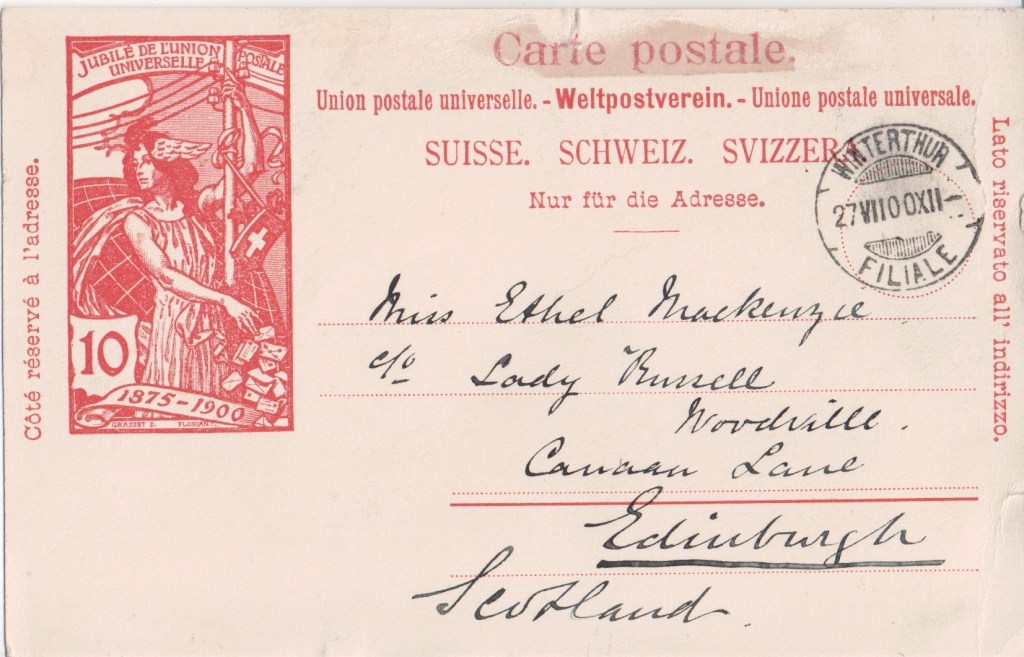 In 1900 the Swiss Federal Council organised a celebration of the 25 years anniversary of the Universal Postal Union and commissioned special stamps and postcards. The same design was used for 5, 10 and 25 cent stamps and postcards bearing the design to the left of the address at the 5 and 10 cent level. S. Florian, of Paris, prepared the original die from the design of D. Grasset. The printing was entrusted to Max Girardet (1857 to 1927) of Berne, and was effected in colour on white paper. Girardet was secretary of the Swiss Society of Painters and Sculptors and it is not clear if he also printed the postcards. He was later prosecuted for selling used plates and proof sheets of the stamps.