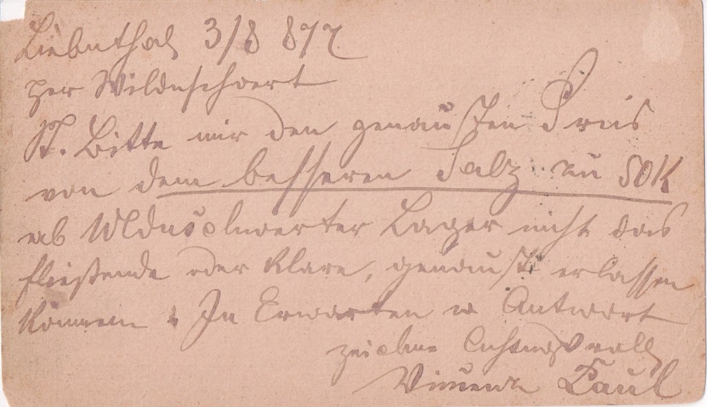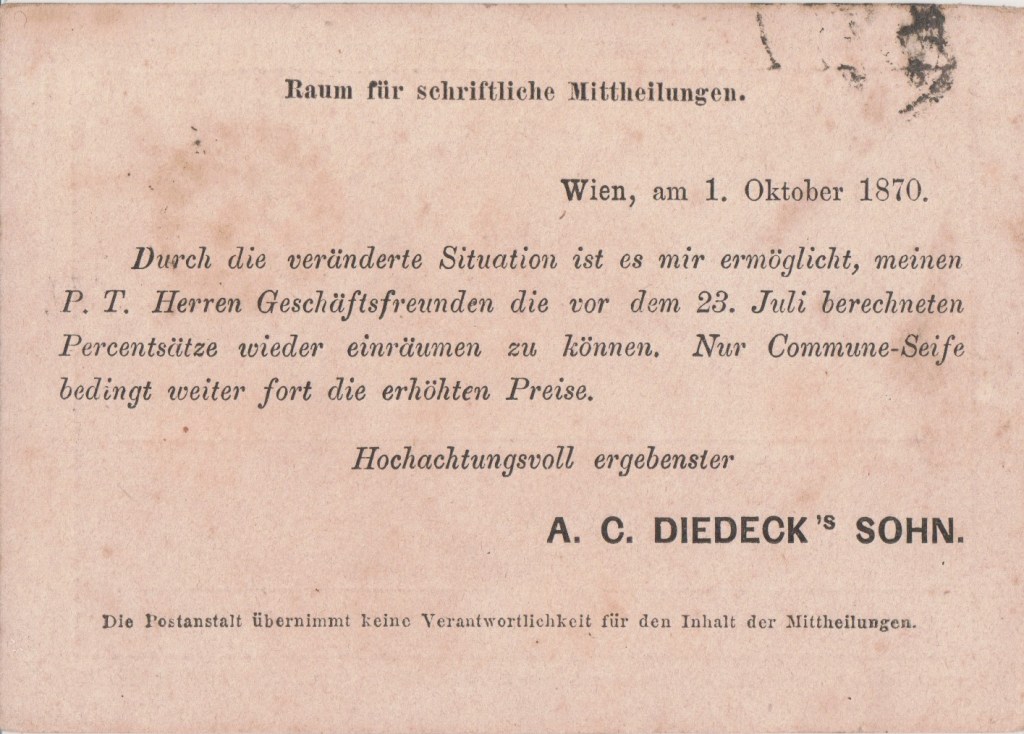 This early postcard was from a man whose family were pioneers in the soap business; On 16 July 1826 Johann Diedeck, Mathias Weisboeck and Johann Fischer registered the equivalent of a patent for a description of candle and soap manufacturing in Vienna. These were the Viennese cleaning soap and the Viennese master candles made from purified tallow.