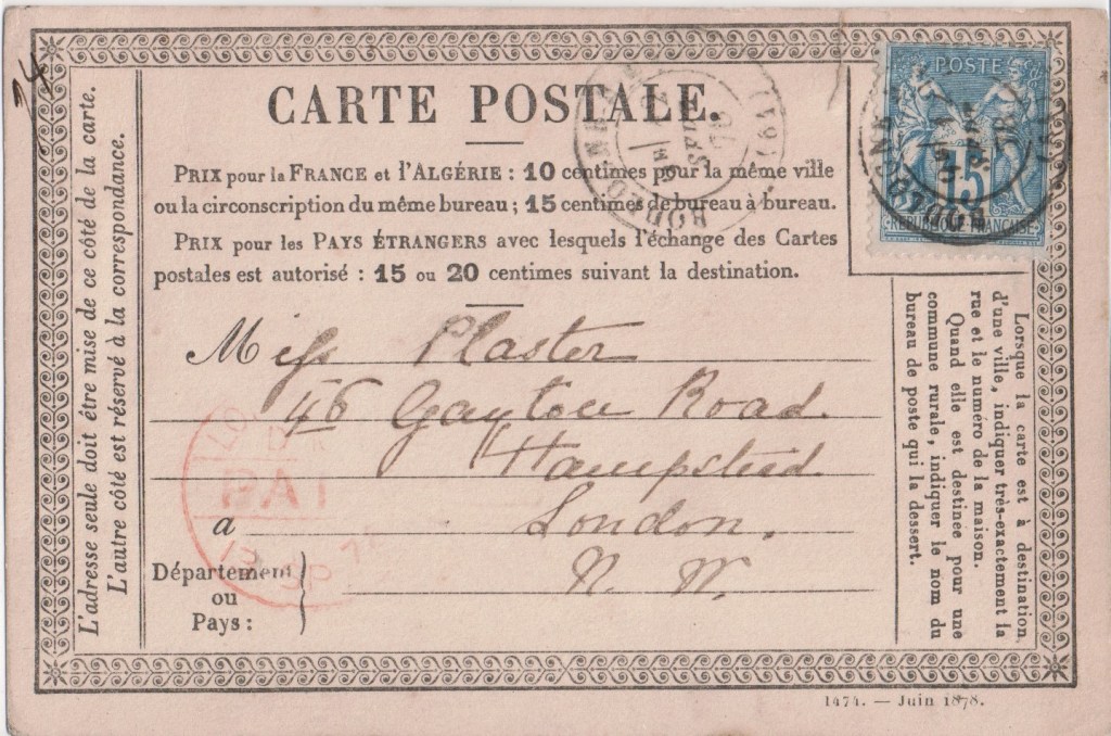 France first issued postcards in 1973. This card was printed in June 1878 in that style. Unlike most official cards, it is not pre-stamped.