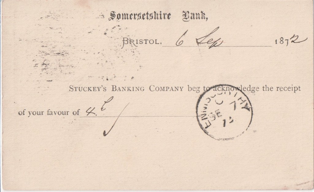 Stuckey’s Bank, as so often happened in the early days of banking, evolved almost imperceptibly from a general merchanting business, that of Samuel Stuckey of Langport. His bank there dated from 1772 and Langport remained its Head Office throughout the 137 years independent life of the bank. 1806 saw the opening of the Bristol Office at 50 Broad Quay. Stuckey’s Bank, a joint stock bank and the second to be formed in the country, was created in 1826 by the amalgamation of three Stuckey family banks along with a private Bristol bank. From 1828 they came under the name Stuckey’s Banking Company, also known as Bristol & Somersetshire Bank. In the heyday of Vincent Stuckey (24 March 1771 to 8 May 1845) their note-issue was the largest in England and Wales after the Bank of England and their notes were widely preferred locally.