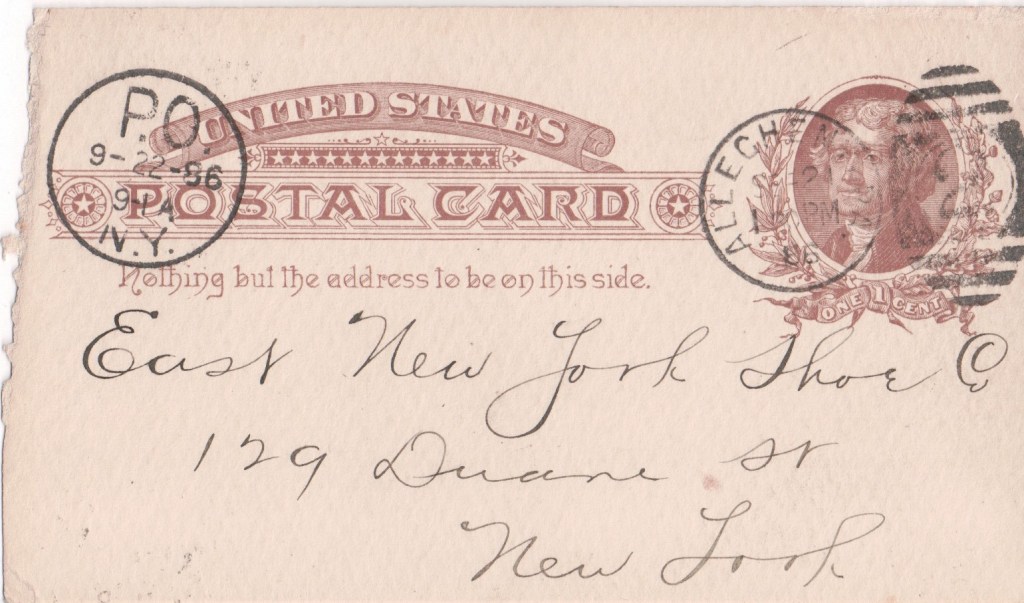 This card: In 1835, Connecticut merchant John Pitkin purchased the land of the Town of New Lots north of New Lots Avenue. He founded the East New York Boot, Shoe & Leather Manufacturing Company shoe factory at what is now Williams Street and Pitkin Avenue in 1838, with its sales department in New York city. Pitkin named the area East New York to signify it as the eastern end of New York City