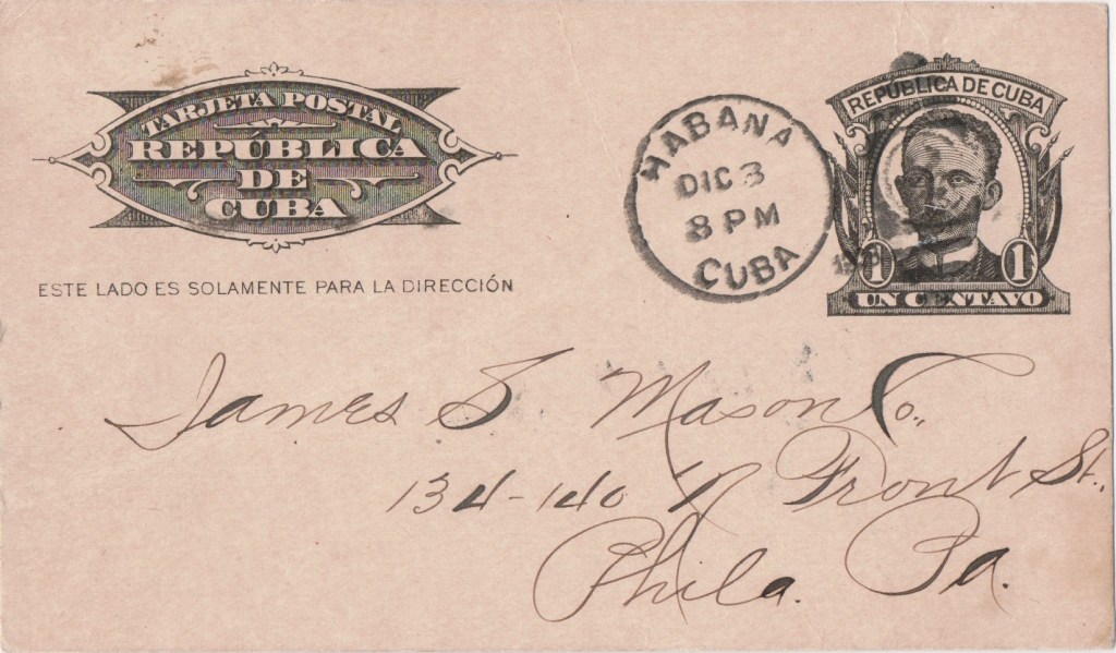 This addressee: James S. Mason & Company, North Front Street, Philadelphia. Mason was a prominent manufacturer of blacking and inks. They were in business from at least 1854 and at this address until 1919.