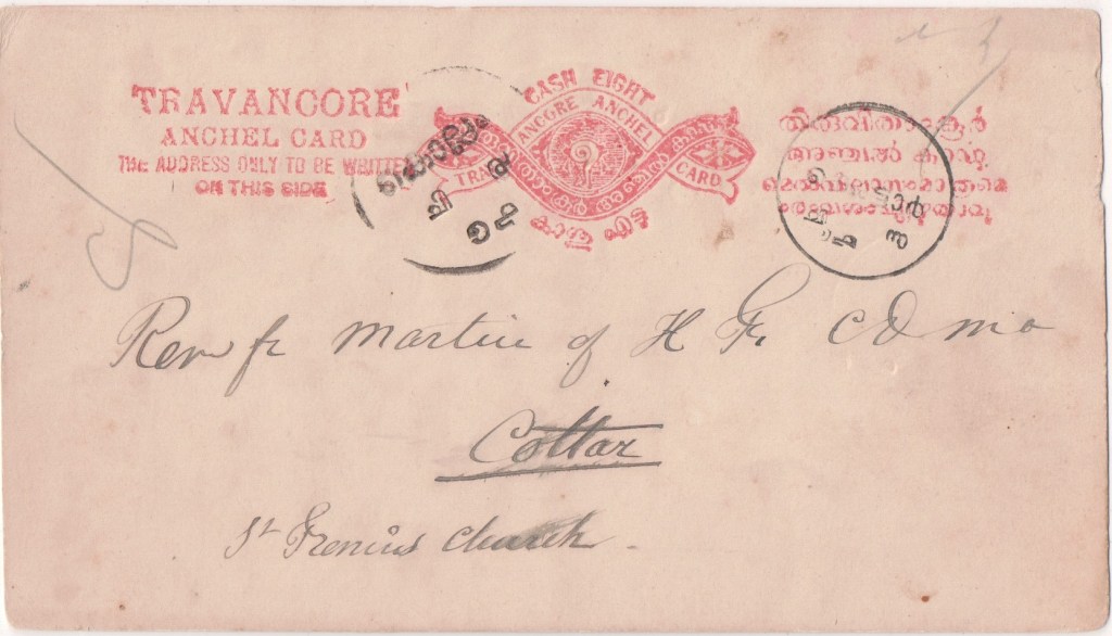 Anchal (post) was the early postal service started in the kingdom of Travancore and Cochin before Independence of India. Travancore includes the southern tip of India The postal service was started in Travancore in 1729 by Anizham thirunal Marthandavarma and later in Cochin in 1770s. Travancore issued its first stamps in 1888. Later it was merged with the India Posts & Telegraph on 1 April 1951 after Independence of India.