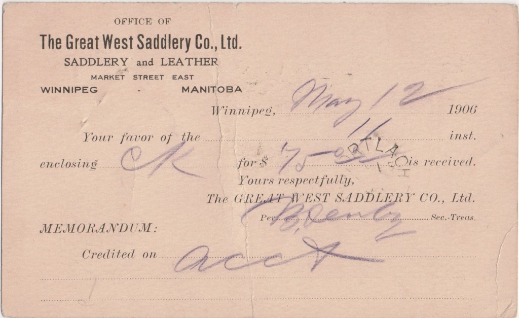 - OFFICE OF The Great West Saddlery Co., Ltd. SADDLERY and LEATHER MARKET STREET EAST WINNIPEG MANITOBA