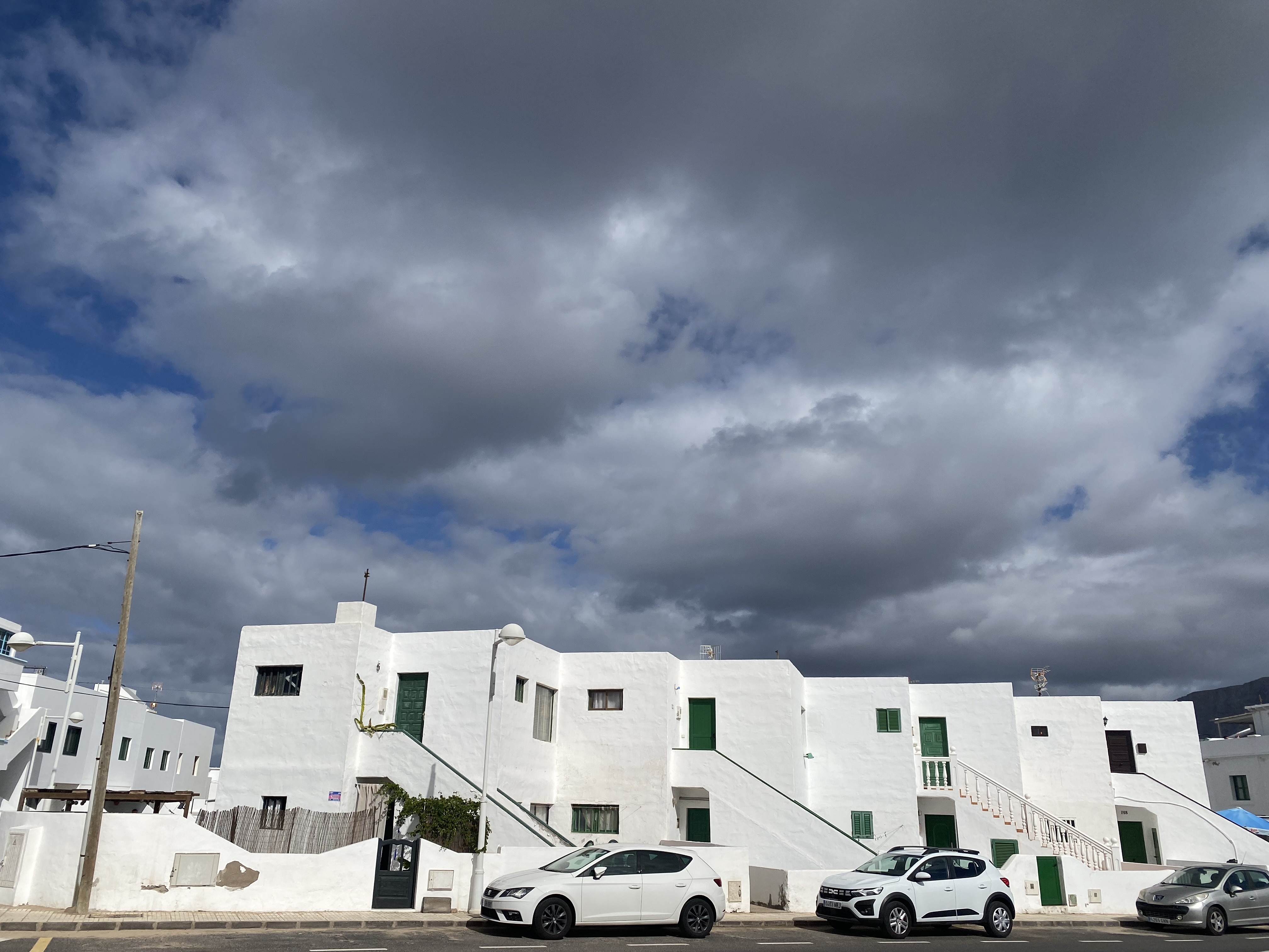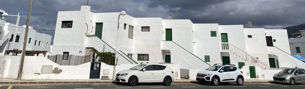 3pm service bus to Arrecife with very dark clouds all the way. The driver’s difficulties in fitting a replacement paper roll results in him issuing blank bits of paper as tickets for a while. Our accommodation is on the street behind the lagoon front. In the cloudy conditions the street looks particularly down at heel. My knock at number 48, the address we have been given, brings forward a weary-looking woman no doubt fed up with such intrusions. We are also civilly rebuffed next door. It transpires that we are at 44 with an entrance on a side street. Three different locks are operated by three different uses of an app we have had to upload to our phones. It is all quite Orwellian.
