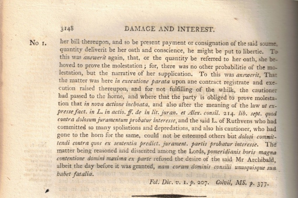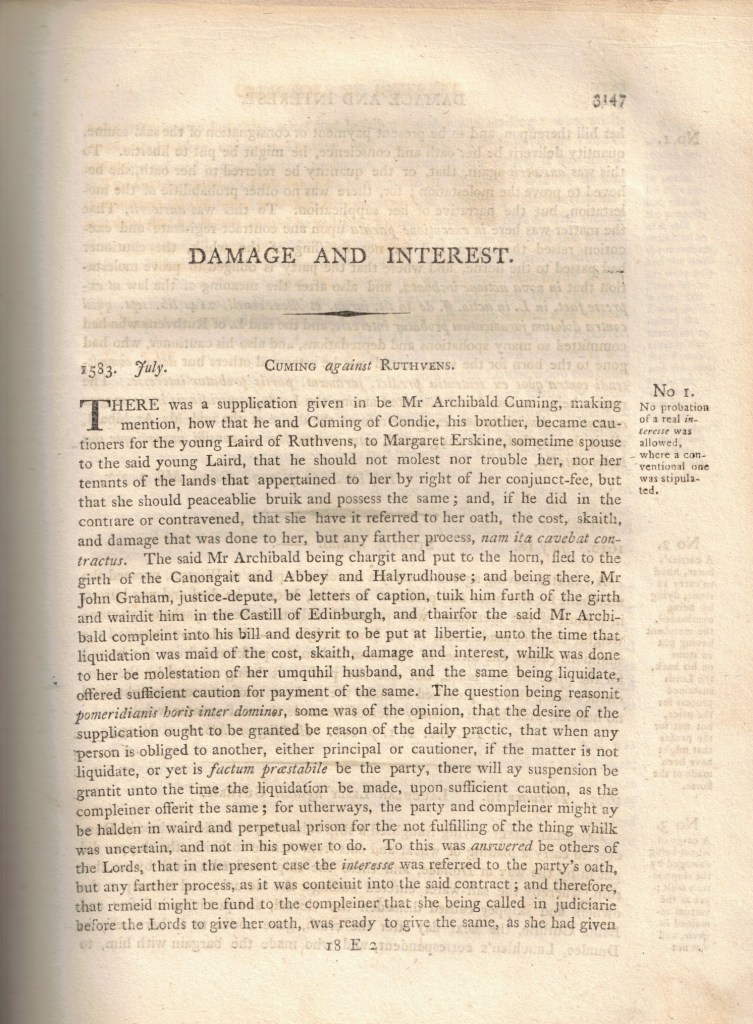 Of the 22 cases reported under the heading Damage and Interest by Morison in 1802, this is the oldest and the only 16th century one. The heading is a translation of damnum et interesse, a latin term used in Scots law to describe the loss and damage sustained by a party, the words referring to actual and consequential loss respectively. They arise in the context of another latin maxim locum facti imprestabilis subit damnum et interesse [damages take the place of an act which was not performed]. In 1926 Lord President Clyde explained that direct loss is the damnum and the consequential loss of the gain or utility is the interesse; “The rule plays, in the contract, a part analogous to that played by the exclusion of remote damage in delict.” (Duke of Portland v Wood’s Trustees 1926 SC 640 at 649).