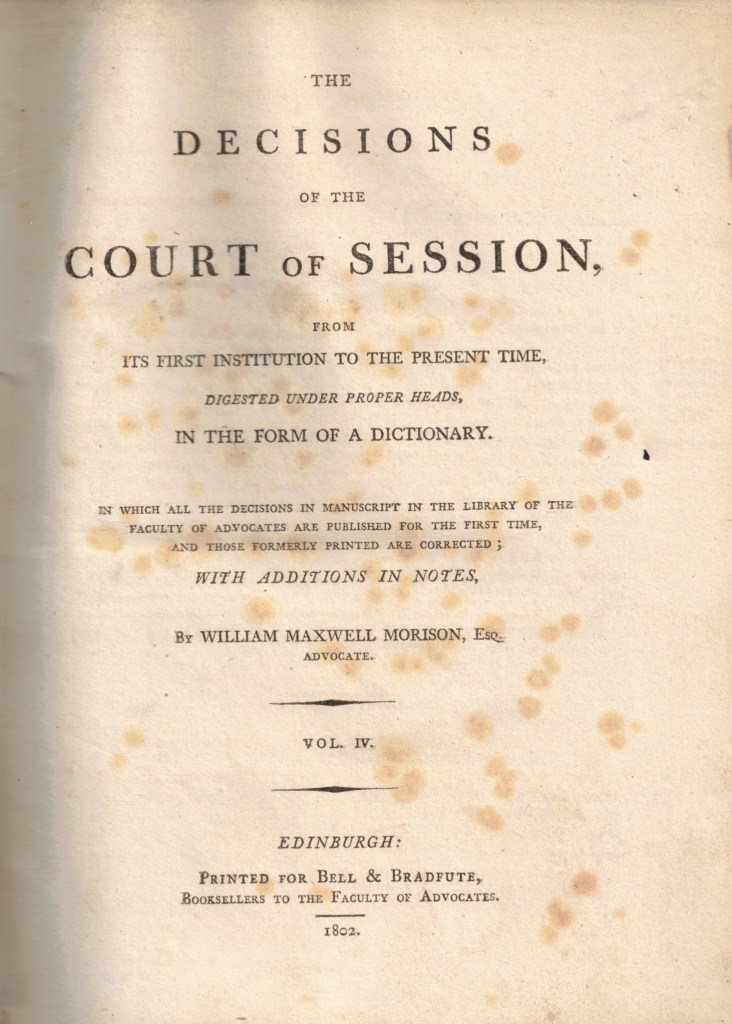 This case is reported in volume 3 of Morison’s Dictionary, published in 1802. William Maxwell Morison (1762 to 30 June 1821) advocate was Sheriff-Substitute of Clackmannan from 1787 to 1789. Morison is best remembered for The Decisions of the Court of Session from Its First Institution to the Present Time, Digested Under Proper Heads, in the Form of a Dictionary (Edinburgh: Bell & Bradfute, 1801 to 1808). Morison collected cases from around the founding of the Court of Session in 1532 to the beginning of the 19th century and arranged them under the legal subject headings of the day.