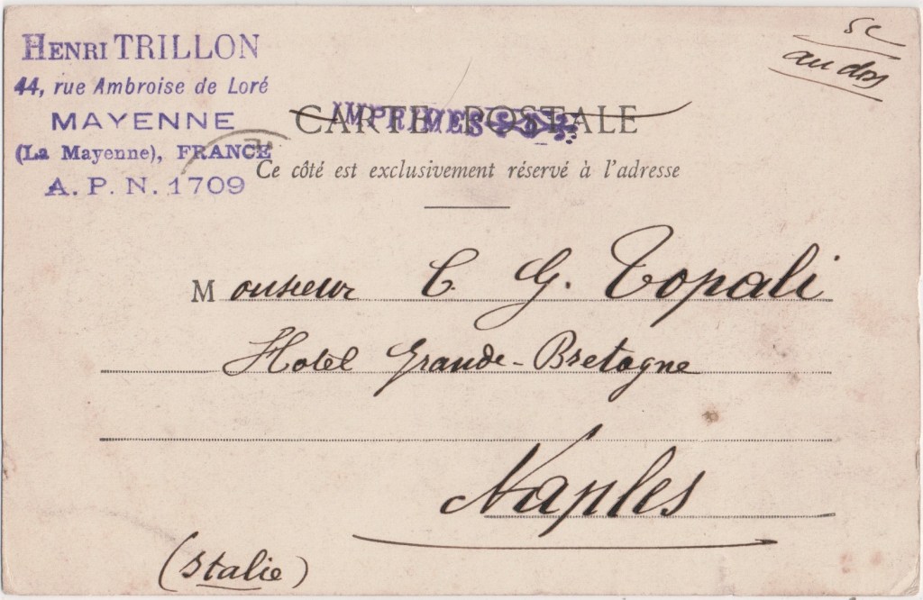 As M Trillon seems to have signed this card, it may be that the stamp is not a retailer’s mark but his personal identification. Mayenne is a department in northwest France named after the Mayenne River. It seems to have been a hotbed of the Trillon clan: Henri Marie Emile Trillon (17 December 1927 to 24 November 2019) and Roger Marie Emile Henri Trillon, (10 January 1922 to 9 June 2009) both died in Mayenne and could be descendants of the Henri Trillon in question. In September 1923 Henri Trillon was Mayenne race secretary at 15 place Juhel there while, to this day Therese Trillon trades as an estate agent from 44 rue Ambroise de Loré. None of this helps provide detail of the Henri Trillon who put his stamp on my card and the APN number is also a mystery.