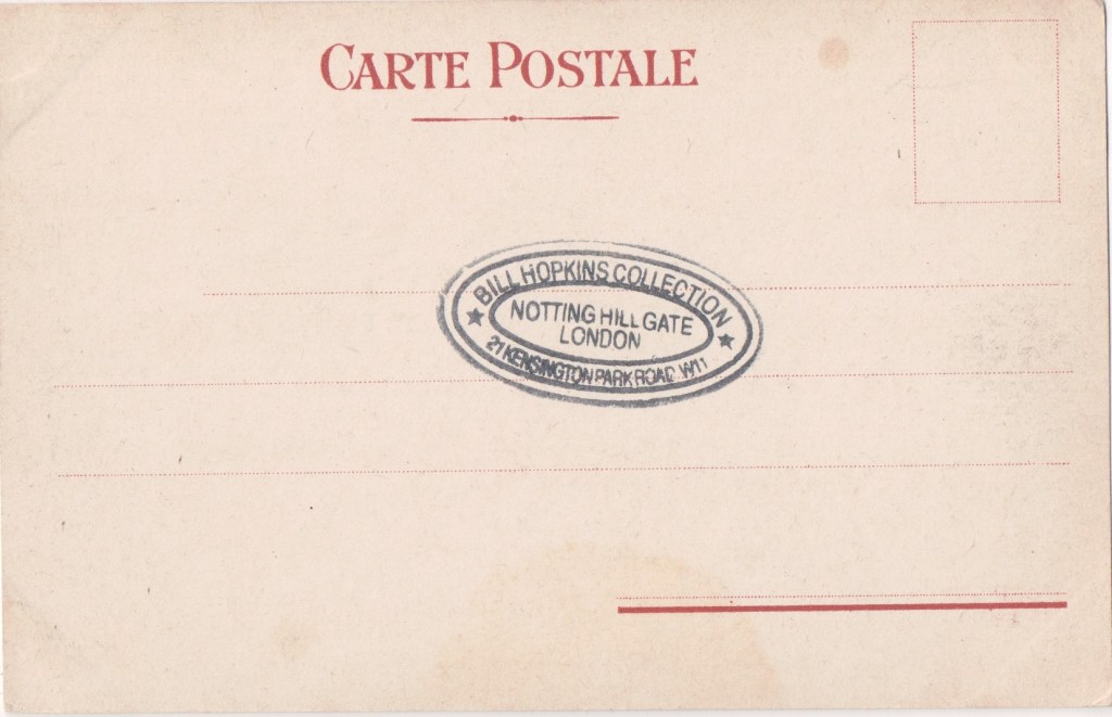 Bill Hopkins (died 2013) was a London-based collector and dealer of long standing with a vast hoard of postcards built up over many years. He set up and ran the Postcard Collector’s Centre in Kensington. Hopkins personalised every card he bought/sold with a handstamp – sometimes twice or more – sometimes with his name etc., sometimes with the London Postcard Centre. In similar vein is the Hogsthorpe Horror (qv).