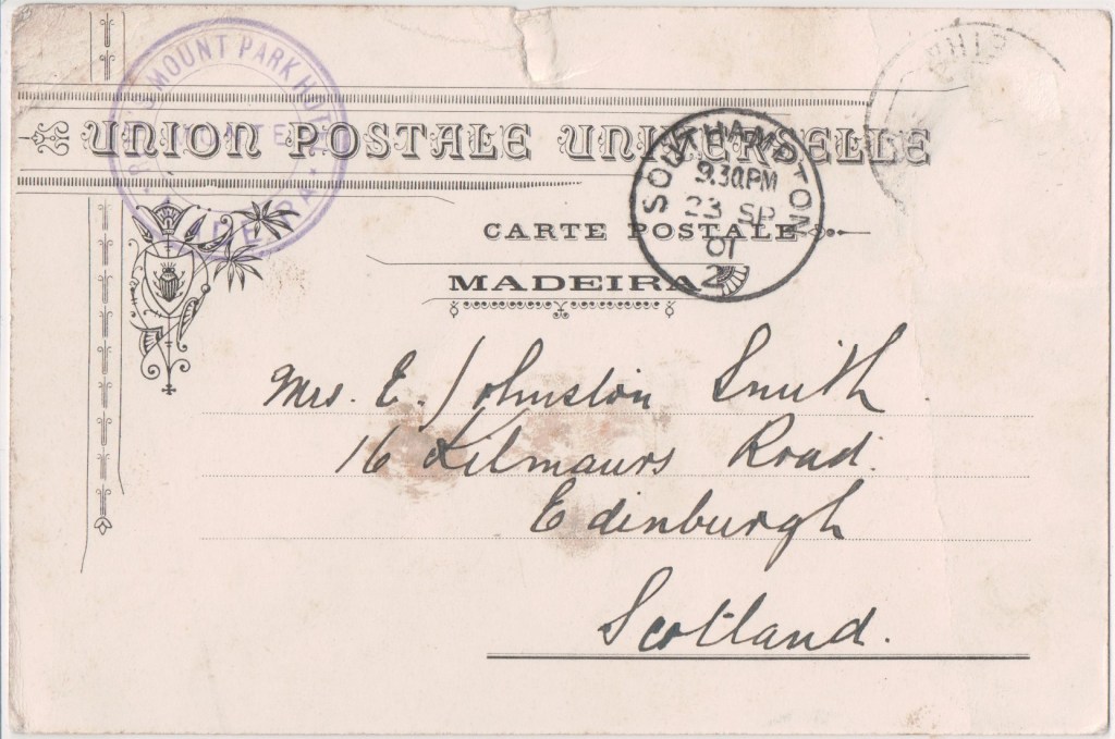 Joaquim Augusto de Sousa and his wife D. Eugénia Maria de Sousa bought this property in December 1897. In April 1903, they leased the property to Alfred Edward Reid for a period of 12 years with effect from 1 December 1903 though the hotel had by then been operating for a couple of years. This card was written by the sender on 18 September 1901 and postally used on 23 September that year.