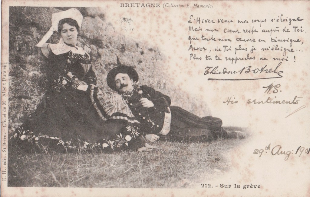 Émile Hamonic (26 August 1861 to 24 July 1943) art publisher, painter and photographer Saint-Brieuc (Côtes d’Armor). He was one of the very first major publishers of illustrated postcards, having begun publishing in Saint-Brieuc as early as 189320. He was a regionalist committed to Brittany, in particular, to the Breton Regionalist Union21. This was a Breton cultural and political organisation created on 16 August 1898. It was a broadly conservative grouping dedicated to preserving Breton cultural identity and regional independence. It expressed the ideology of mainly middle-class and aristocratic groups to secure continuity in local administration and Breton culture22. Unsurprisingly, the information on his cards was largely in Breton. In 1908 Hamonic was listed in an Alphabetical Directory of living and deceased members of the College of Druids, Bards and Ovates23 of Brittany24. A collection of his glass plates is in Archives-finistere.fr.