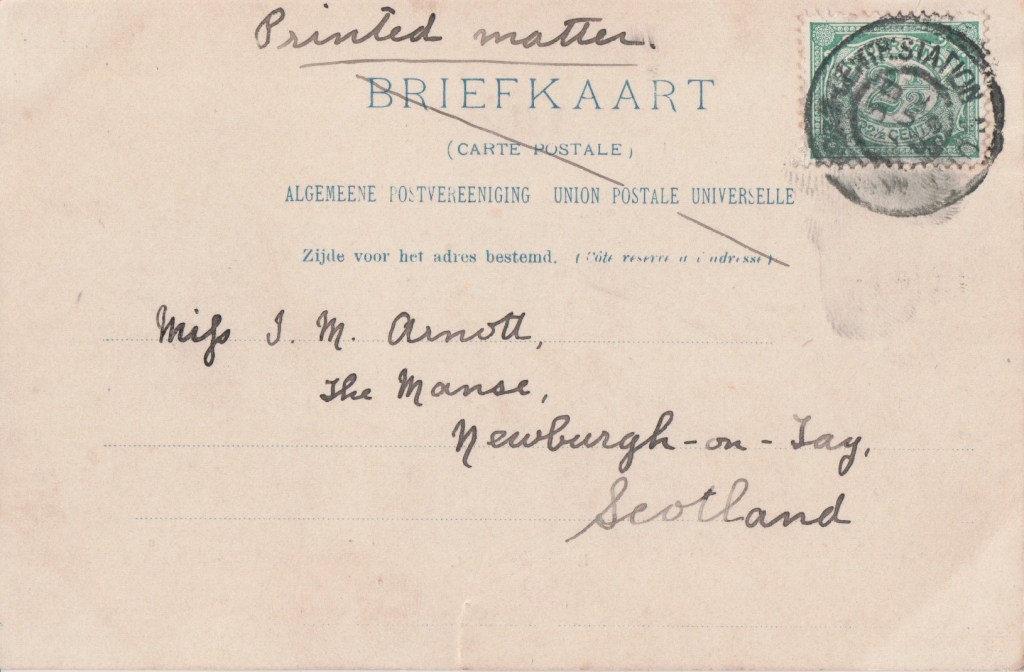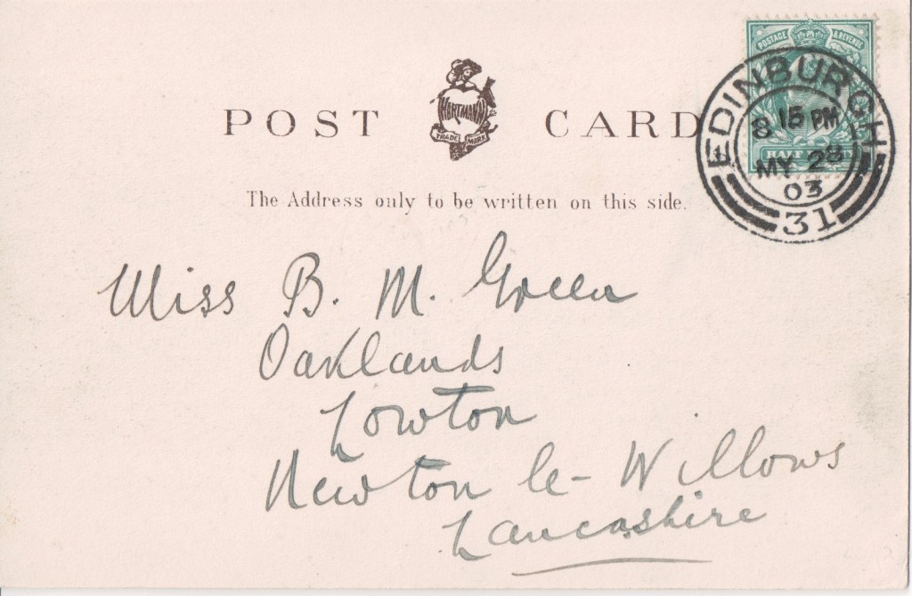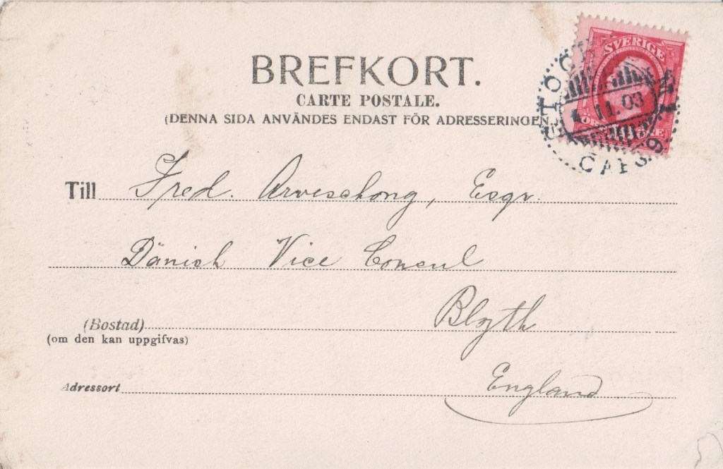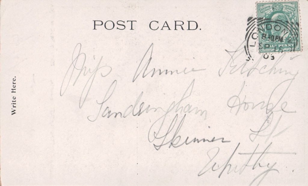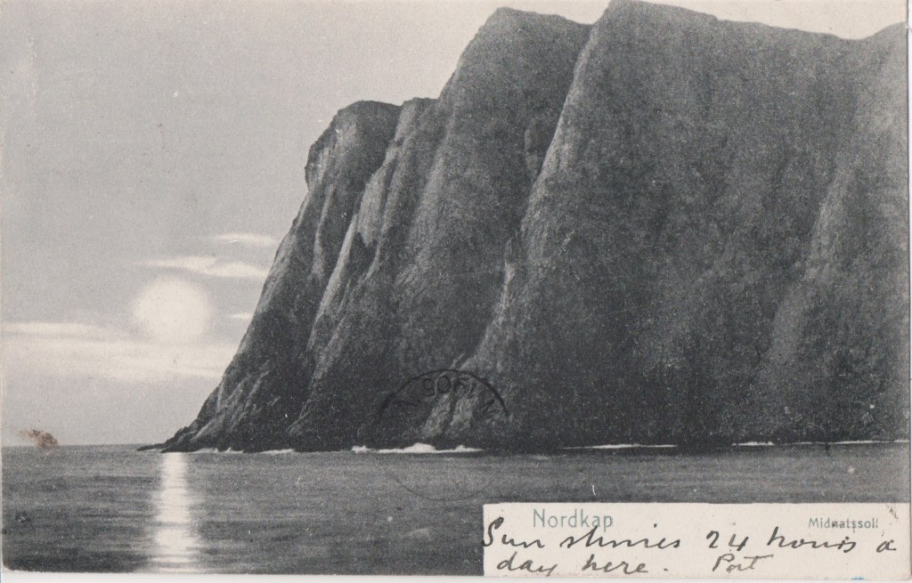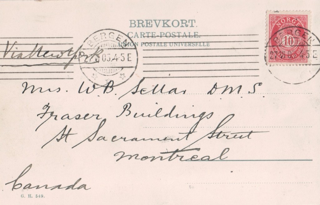 This card was sent by Pat in June 1903, at the height of the midnight sun, to Mrs W B Sellar OMS [or DMS] Fraser Buildings, St Sacrament Street, Montreal, Canada. At that time there were may have been two Mr WB Sellars in Montreal; W. B. Sellar who was a QC there in 1886 and one who was born in 1849, at Keith, Banffshire, Scotland. He went to Canada in about 1887, representing Messrs. Heyman & Alexander, lace-makers of Nottingham, and made his home in Montreal thereafter. In 1907 Style journal of the clothing industry reported that he had died in London, after having taken ill while on his customary trip to the Old Country.