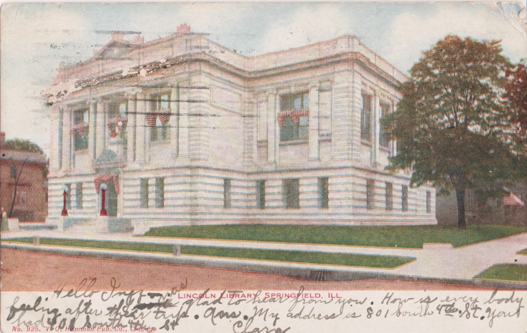 This card: Lincoln Library, Springfield Illinois. In 1856 a group of Springfield businessmen organized a subscription library. Known as the Springfield Library Association, members or stockholders of the organization were able to check out books from the library. In 1899, a request was sent to the industrialist and philanthropist Andrew Carnegie asking for funds to help build a new library building. The firm of Mauran, Russel and Garden of St. Louis was hired to design the new building. Construction began in 1902 and was completed in 1904, with the building being dedicated on June 7, 1904. Carnegie chose to rename the library as Lincoln Library. It was demolished in 1974 to make way for the current building.