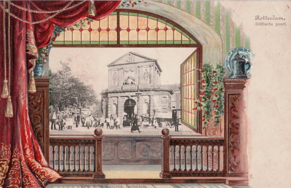 This card: The Delftsche Poort in Rotterdam was a city gate, the third and last of which was built in 1764 to a design by architect Pieter de Swart. It didn’t survive WWII. Fifty years later, a reconstruction in steel, designed by the artist Cor Kraat, was erected on almost the original site of the Delft gate on the Pompenburg, decorated with some remnants of the carved ornaments of the earlier gate.