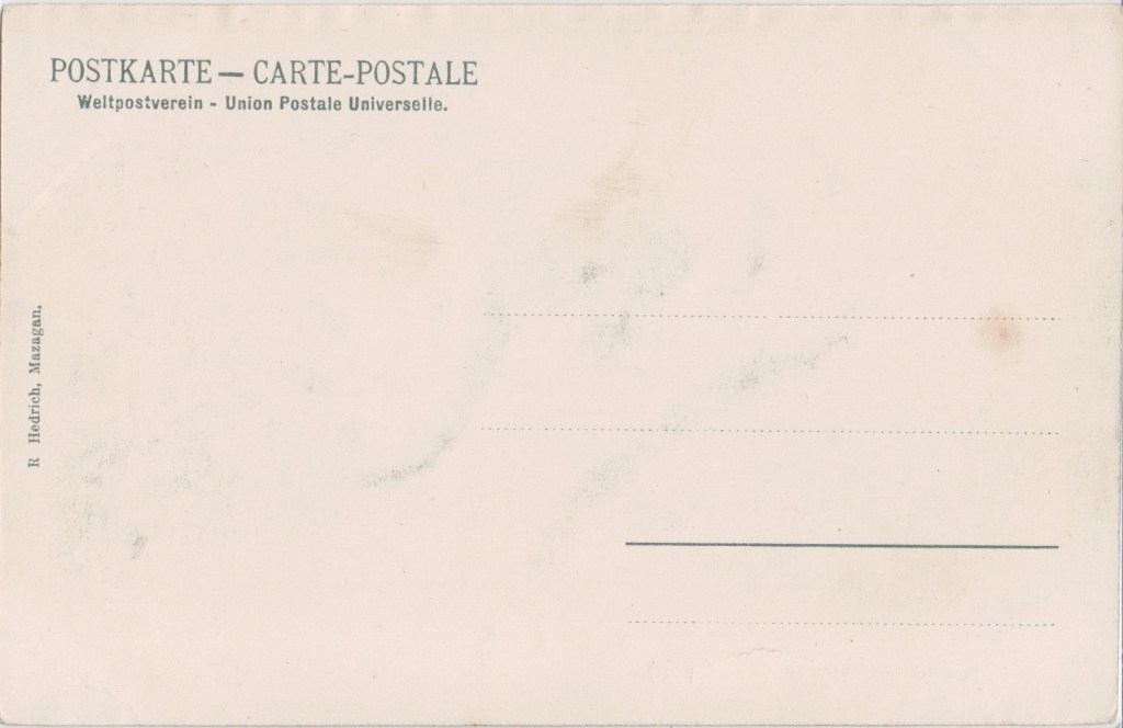 The Hamburg-Amerikanische Packetfahrt-Actien-Gesellschaft13, HAPAG for short, was a transatlantic shipping enterprise established in Hamburg, Germany, in 1847. Among those involved in its development were prominent citizens such as Albert Ballin (Director General), Adolph Godeffroy, Ferdinand Laeisz, Carl Woermann, August Bolten and its main financial backers were Berenberg Bank and H. J. Merck & Co. It soon developed into the largest German, and at times the world’s largest, shipping company, serving the market created by the German immigration to the United States and later immigration from Eastern Europe. On the 1906 cruise to the West Indies of the Prinzessin Victoria Luise, the department of cruises published daily postcards with images from cards published by the Detroit Photographic Company (qv) and others and progress cables from Captain Brunswig to the company’s New York Office. On 1 September 1970 HAPAG merged with the Bremen-based North German Lloyd to form Hapag-Lloyd AG14.