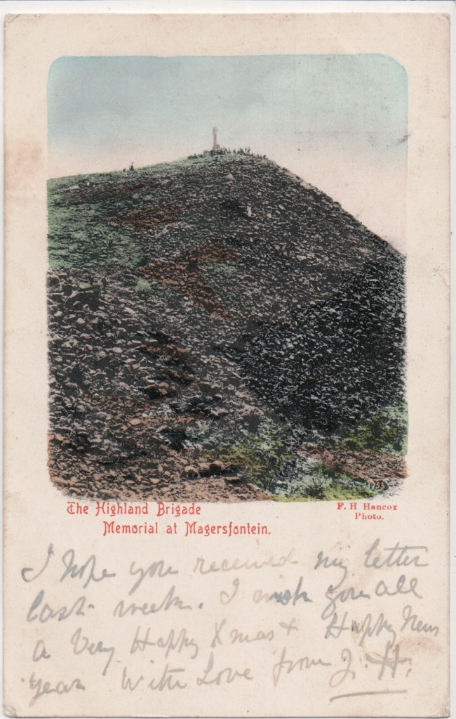 This card: Highland Brigade Memorial at Magersfontein. The Battle of Magersfontein was fought on 11 December 1899 near Kimberley. British forces under Lieutenant General Lord Methuen were advancing north along the railway line from the Cape to relieve the siege of Kimberley, but their path was blocked at Magersfontein by a Boer force that was entrenched in the surrounding hills. The British had already fought a series of battles with the Boers, most recently at Modder River, where the advance was temporarily halted.