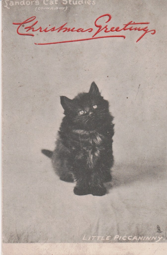This image dates from 1903 and was repeatedly issued as a divided-back. Photographer Charles Reid also produced images of cats for Tucks (notably Series 866) but it is not clear what input he had to the use of this image of Landor’s.