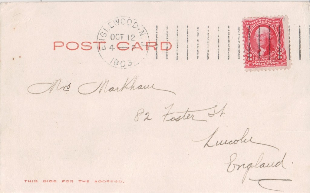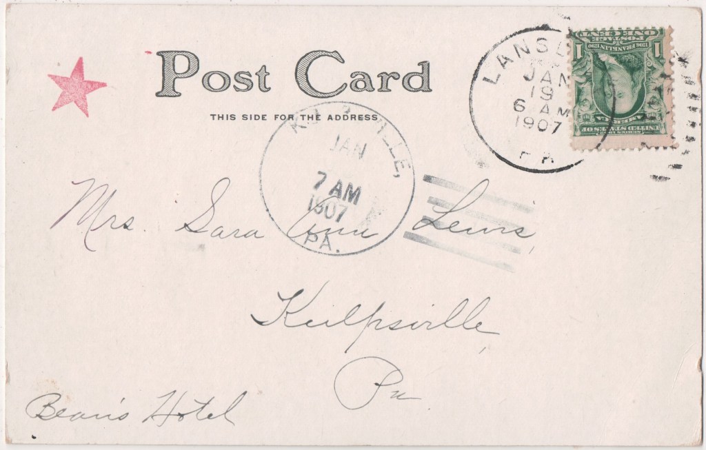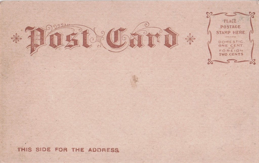 This card features a joke dating from twenty or more years earlier that became popular in the US around 1905-06. It gave rise to a spate of merchandise and recordings featuring The Whole Dam Family — a film, a record, many postcards, some with very nice cartoon art. The wordplay, in which references are made to the Dam father, the Dam housekeeper and so on, was somewhat risque in a day when even a “drat” was strong language.