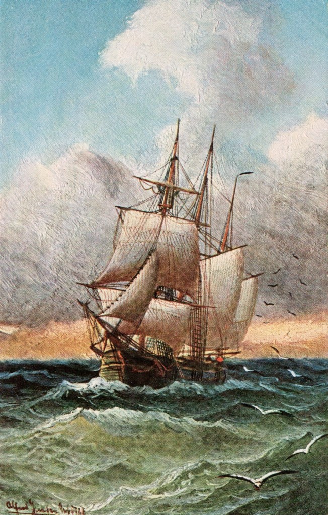This card: Alfred Serenius Jensen (16 November 1859 to 29 June 1935) marine painter. Danish-born Jensen went to sea at the age of 14 to Africa, Australia and China among others. From 1884 to 1885 he studied with Heinrich Leitner in Hamburg. Then he went back to sea. In 1897 he continued his studies, this time at the Academy in Kassel with Emil Neumann. Afterwards, he lived in Hamburg and worked as a professor at the local arts and crafts school. Source: wikipedia