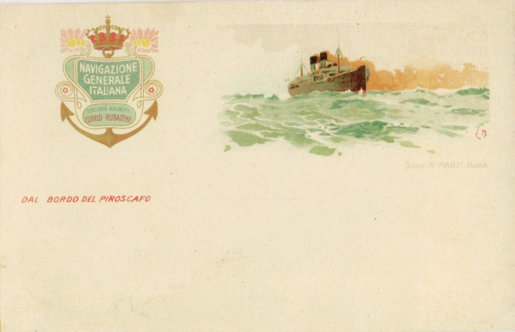 In the first years of the twentieth century, with the arrival of the liners of the “Region class”, fitted with a small cabin class, NGI was compelled to alter the style of its postcards and ships’ portraits. The Marzi company printed a series of postcards in full colour, based on the artworks of well-known artists, mainly from the Ligurian area, such as Aurelio Craffonara (qv). At this time, the postcards and the other advertising material were enriched by a new and stylish NGI logo in the Art Nouveau style. From then on, NGI postcards were always in colour, downsized portraits of the ships or of the large posters designed to promote them.