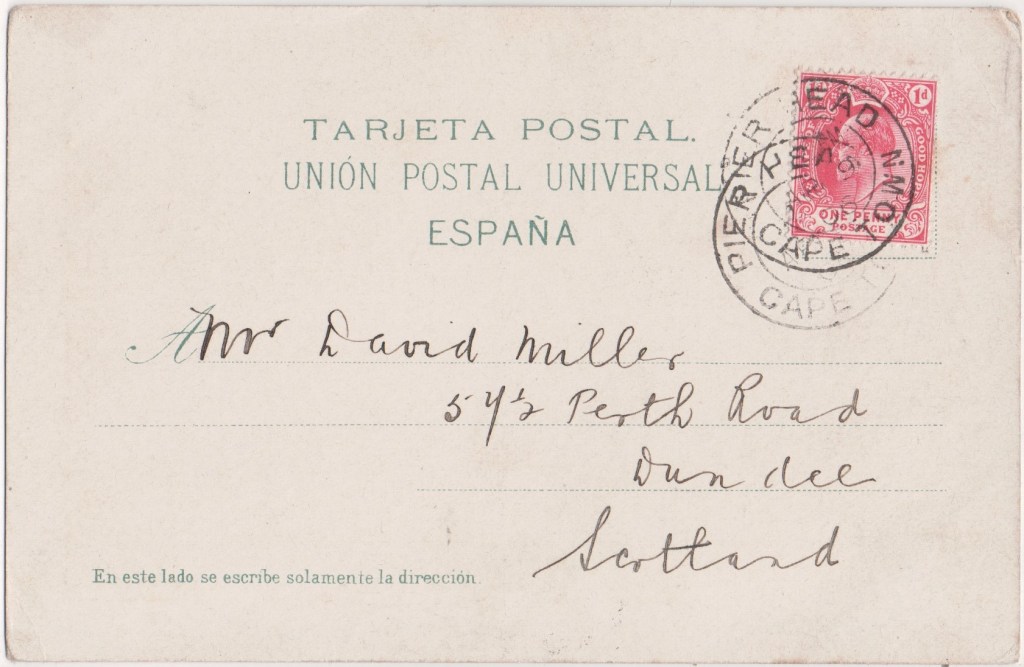 This card: The sender appears to have bought this card in the Canary Islands but not to have sent it until he reached the Cape of Good Hope. Pier Head was a post office in Cape Town between February 1905 and 1907.