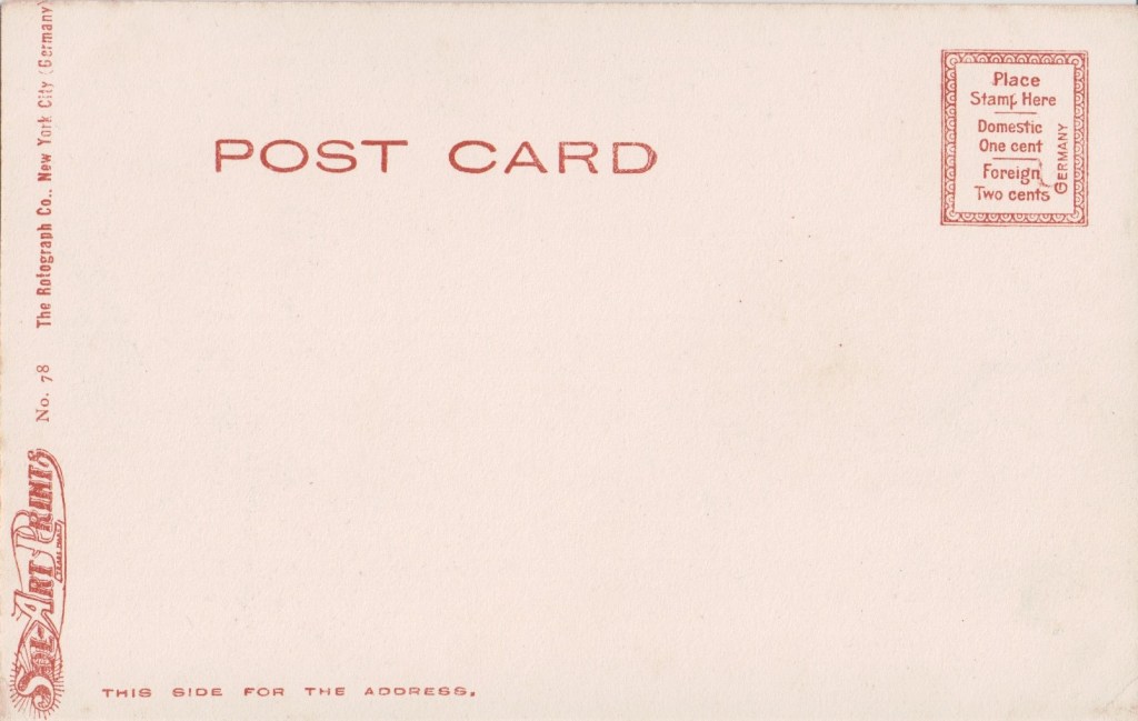 The Rotograph Company manufactured postal view cards of American scenes from around 1904 to 1911. It was formed from the merger of the National Art Views Company (active 1902 to 1904), based in New York City, with the American branch of the Neue Photographische Gesellschaft (qv), founded in 1894, which apparently was the corporate parent. Arthur Schwartz, NPG’s president, directed overall operations from Berlin; the vice-president, Ludwig Knackstedt, supervised its factory in Hamburg; and the former proprietor of the National Art Views Company, Frederick Schang, became the general manager of Rotograph’s American operations.