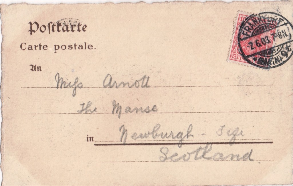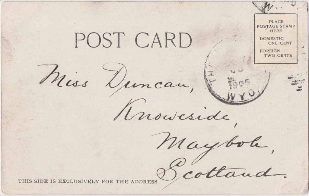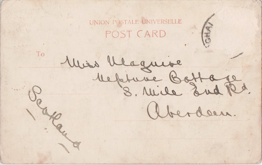 This addressee: Mid Kinmouth is a farm in Aberdeenshire. Mid Kinmouth is situated near to Drumlithie, where Miss Low collected her mail from the post office. This is a village in the Howe of the Mearns in southern Aberdeenshire, Scotland, situated seven miles south of Stonehaven in the parish of Glenbervie. Drumlithie is noted for its appearance in the classic Lewis Grassic Gibbon novel Sunset Song. For reasons that are not clear, this former weaving village is informally known by locals as “Skite”. Source: wikipedia: Drumlithie