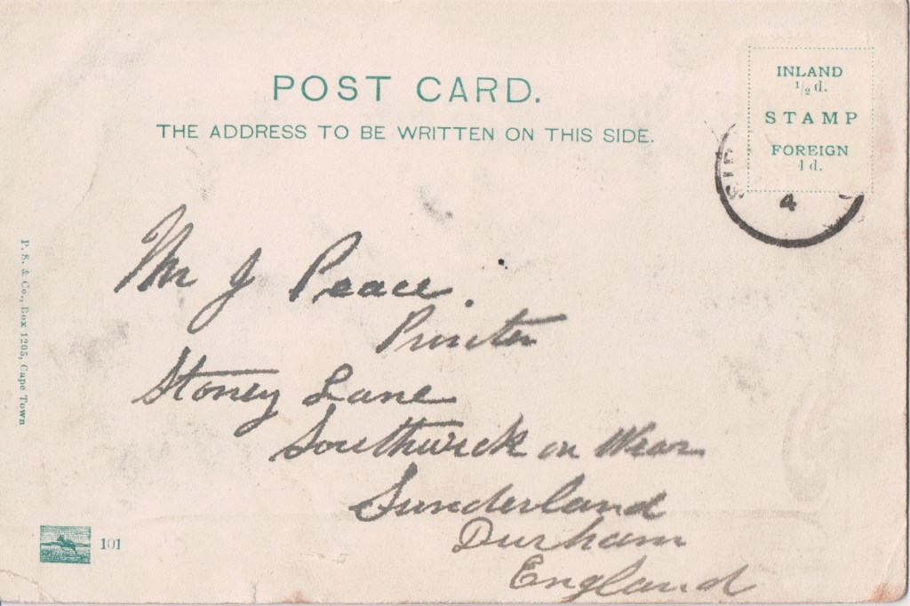 - Photo by T.D. Ravenscroft, Rondebosch on the photo side and, on the reverse, P.S. & Co., Box 1205, Cape Town