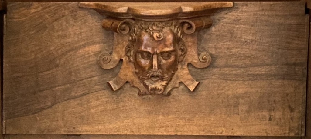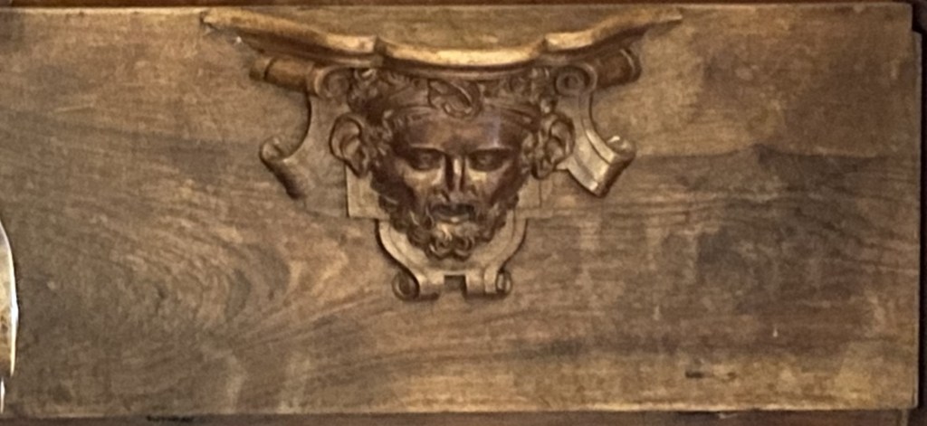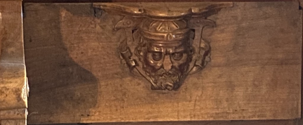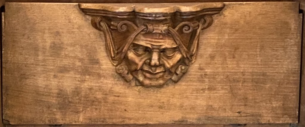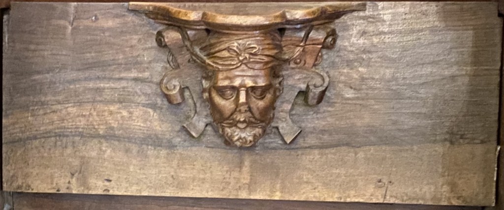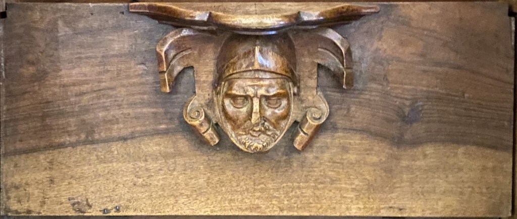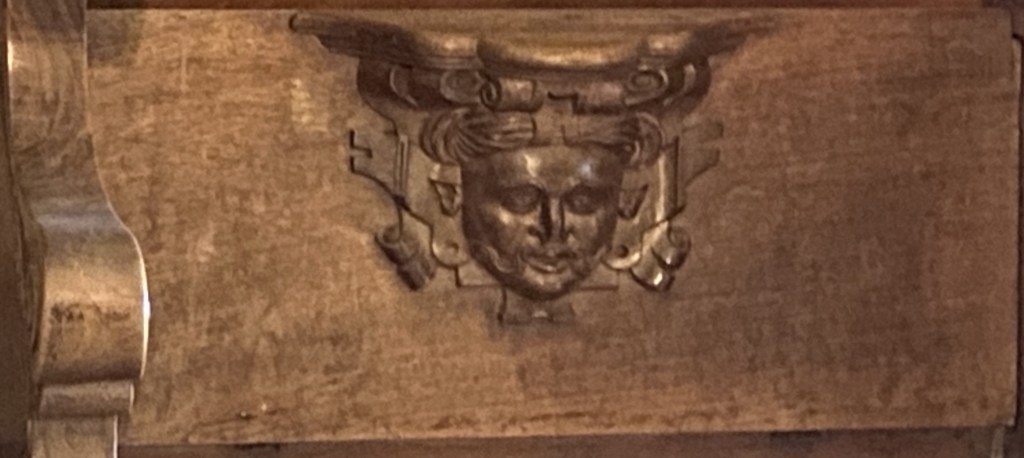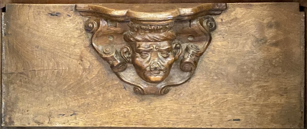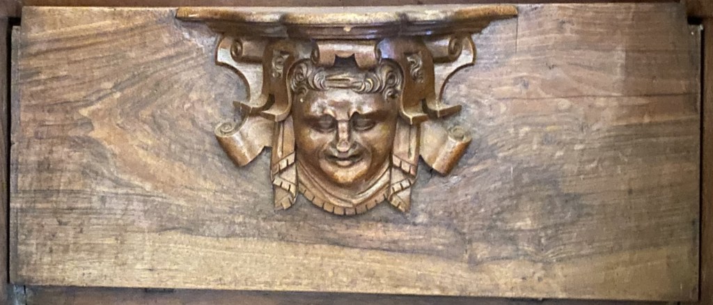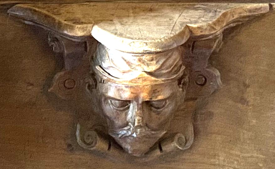 So were these guys? Portraiture rarely exists in a vacuum so one can conjecture that they are people known to the creators of the misericords. Of the 56 faces, half a dozen (E1, E5, E9, E14, W15 and W17) can be described as caricatures or fantastics. But the rest are fairly straight-forward portraits. Combine this with the practice of artists of including themselves when the opportunity arises and one can speculate that it is the woodcarver himself who is shown in image E14 sticking his tongue out at us.